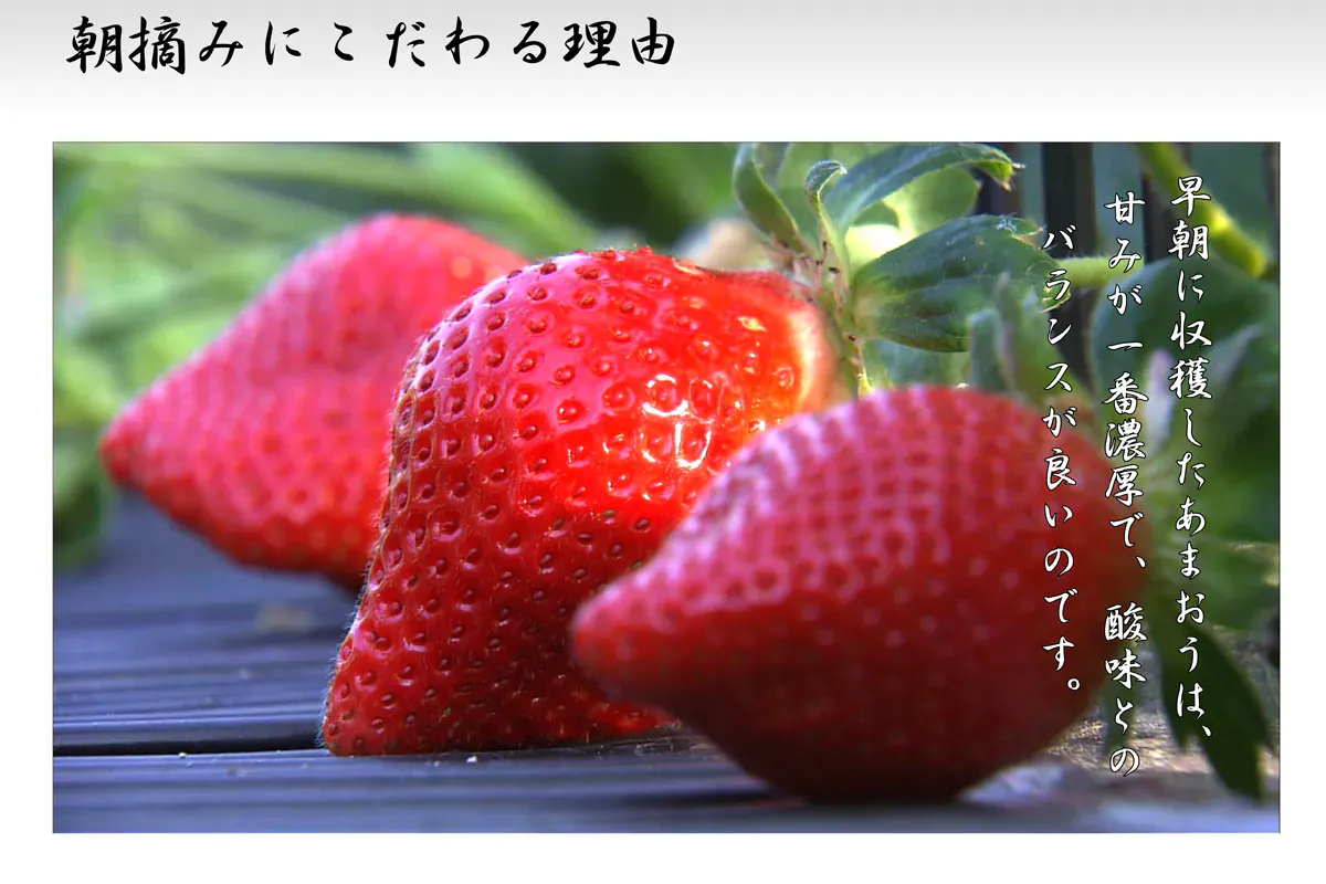 早朝に収穫したあまおうは、甘みが一番濃厚で、酸味とのバランスが抜群!