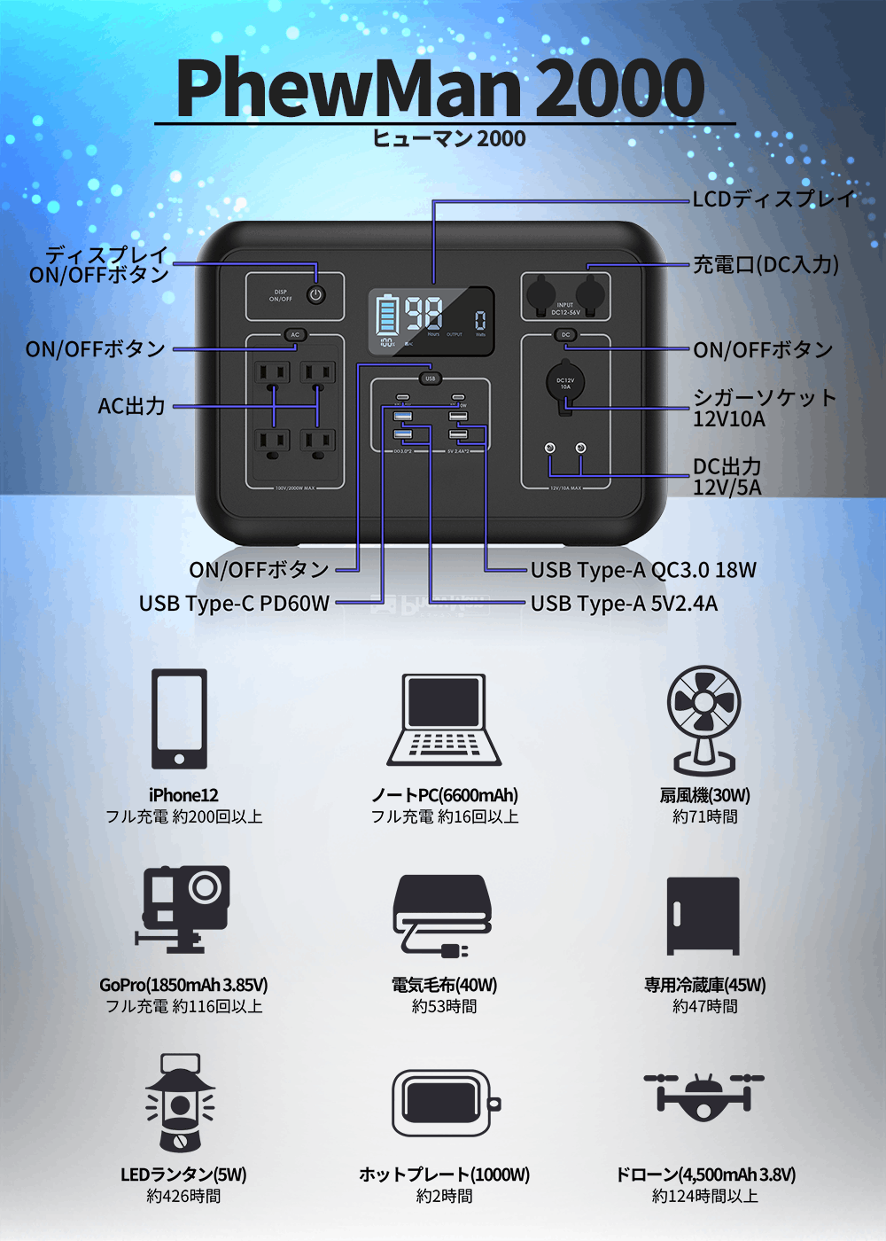 充電口とアダプターを改善することにより、約4時間でフル充電が可能となりました。多くはソーラーパネルを4-6台も使用することで短時間を実現していますが、PhewMan2000はACアダプターのみで急速充電を実現しています!
