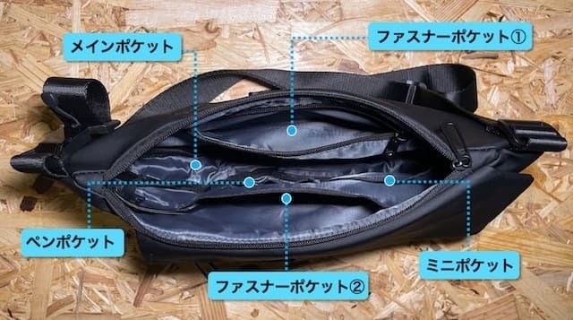 メイン収納はコンパクトながらも3ポケットあり、iPadや500mlのペットボトル、モバイルバッテリー、財布に携帯、ペンも入る収納力。