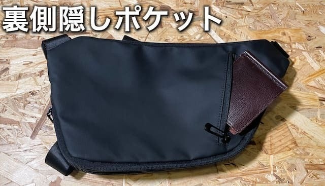 裏面には奥行き最大約20cm × 入口幅約14cm の財布やパスポートなどの貴重品収納もできる隠しポケットがあります。