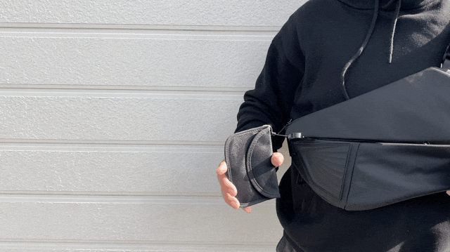 大切なものを持ち運ぶスリングバッグ。裏面は体に密着する機会が多く、バッグを身につけていると他の人からは気づかれない為、財布や貴重品入れにおすすめです。