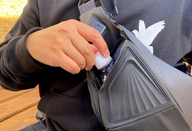 さらに前面部分にポケットは500mlのペットボトルがぴったり入る奥行き約26cmの隠しポケットがあります。
