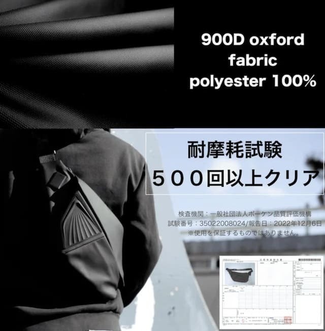 900Dのしっかりした織りの生地を採用することで日常生活を送る上で生じる摩擦にも強いのが特徴です。第三者機関にて耐摩耗試験JIS L 1096A-1法(平面法)で試験を行った結果500回以上擦っても破れない結果でした。