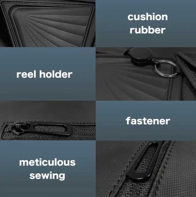 その下にはRFID SAFE技術を採用されたポーチと伸びるリール収納のポケット。ポーチは大切なカード収納や車のキー、家や自転車の鍵の収納としても便利です!