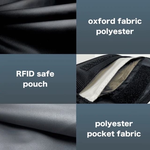 収納は大容量のメインポケットを含め、携帯などの収納にも便利なファスナーポケット(1)とRFID対応のカードケース搭載のファスナーポケット(2)、ペットボトルや折り畳み傘などの収納も可能なボトルポケット、財布入れとしてもオススメな裏ポケットの計5箇所!