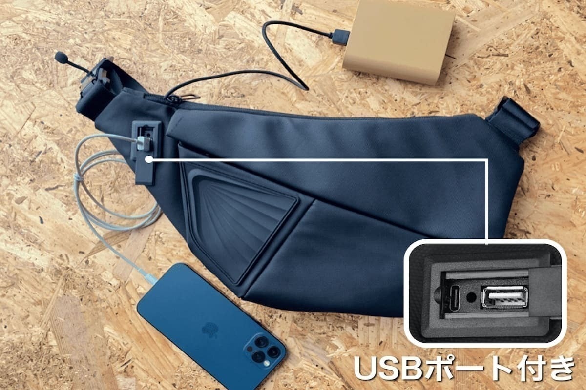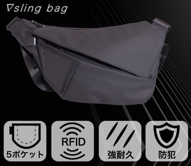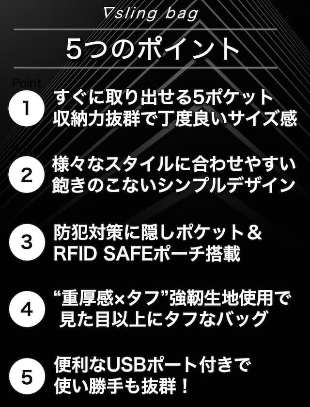 今回取り扱うバッグは5ポケットなのに大容量で防犯対策にも優れ、USBポート搭載で使い勝手も抜群なスリングバッグです!