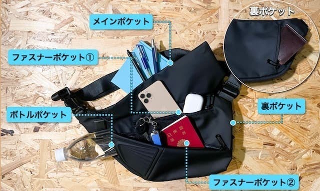 見た目は薄く収納力が小さくみえますがペットボトル、お財布、携帯、イヤホン、本等収納力も兼ね備えています。