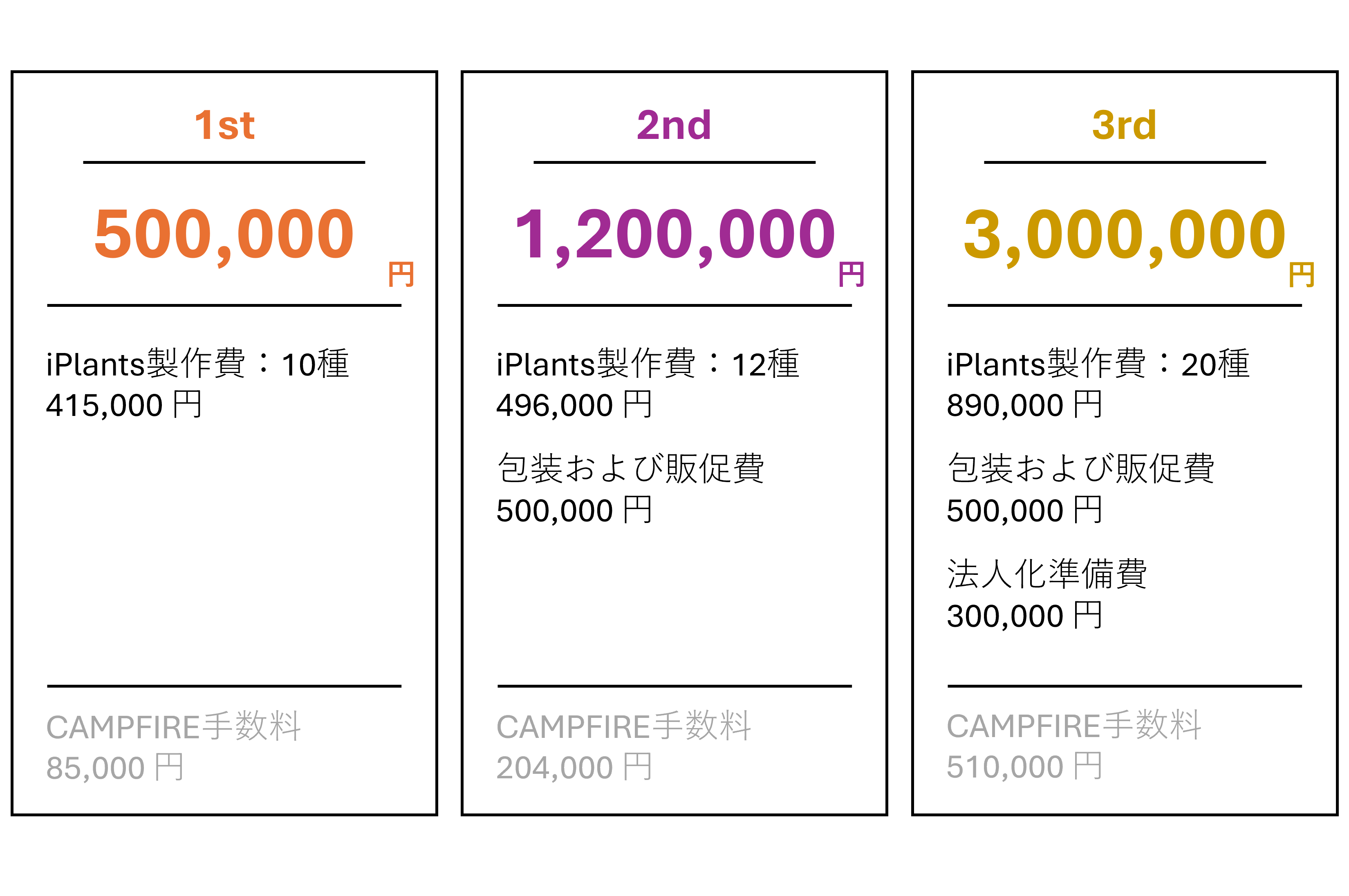 今回のクラウドファンディングでは3つのゴールを設けます。1stゴールは500,000円です。1種の植物をiPlantsにするためには撮影費とトリミング加工費で40,000円の費用が必要ですので、手数料を除いた資金で新たに10種をiPlantsにすることができます。2ndゴールは1,200,000円です。iPlantsにする種数を増やすとともに、iPlantsを使った魅力的な商品を作るための費用に充てさせていただきます。そして、3rdゴールは3,000,000円です。さらに種数を増やせるとともに、2ndゴール同様、商品を作るための費用に充てます。また、3rdゴールを達成するほど反響があるということは需要アリと見込めるため、法人化するための費用に充てさせていただこうと考えています。