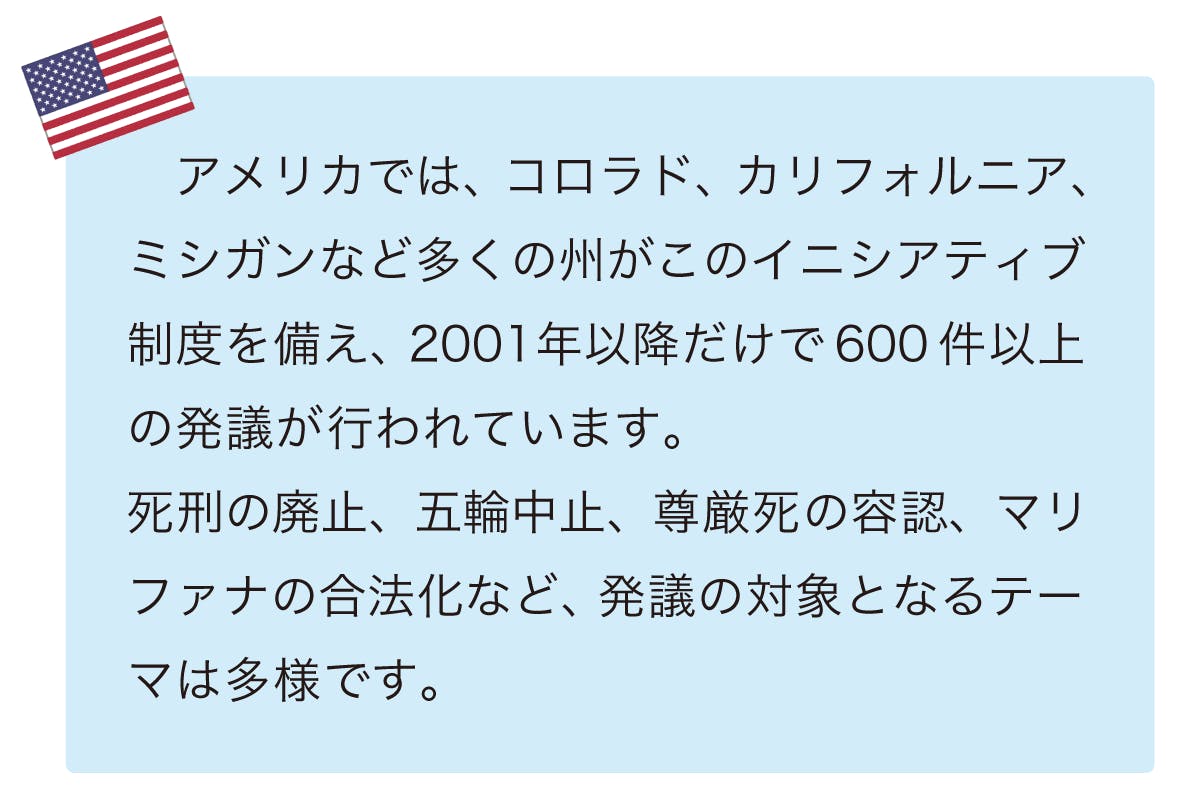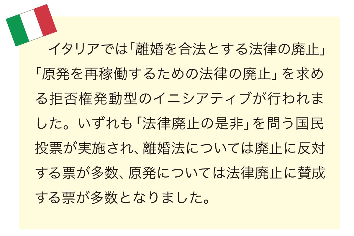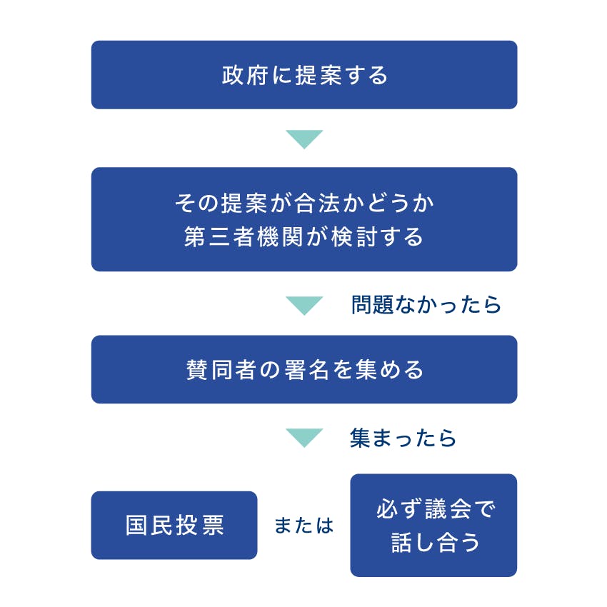 もし日本にもこのようなイニシアティブ制度があれば、一定数の賛同署名を集めることによって、何かを「拒否」したり、「提案」したりすることが可能になります。
