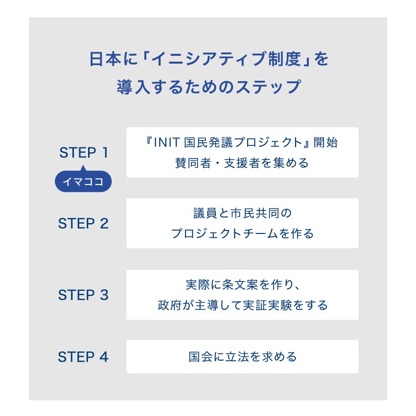 ※日本にイニシアティブ制度を導入する道筋については、INITのウェブサイトで詳しく解説しています。⇒動画で解説「イニシアティブ制度実現への道」