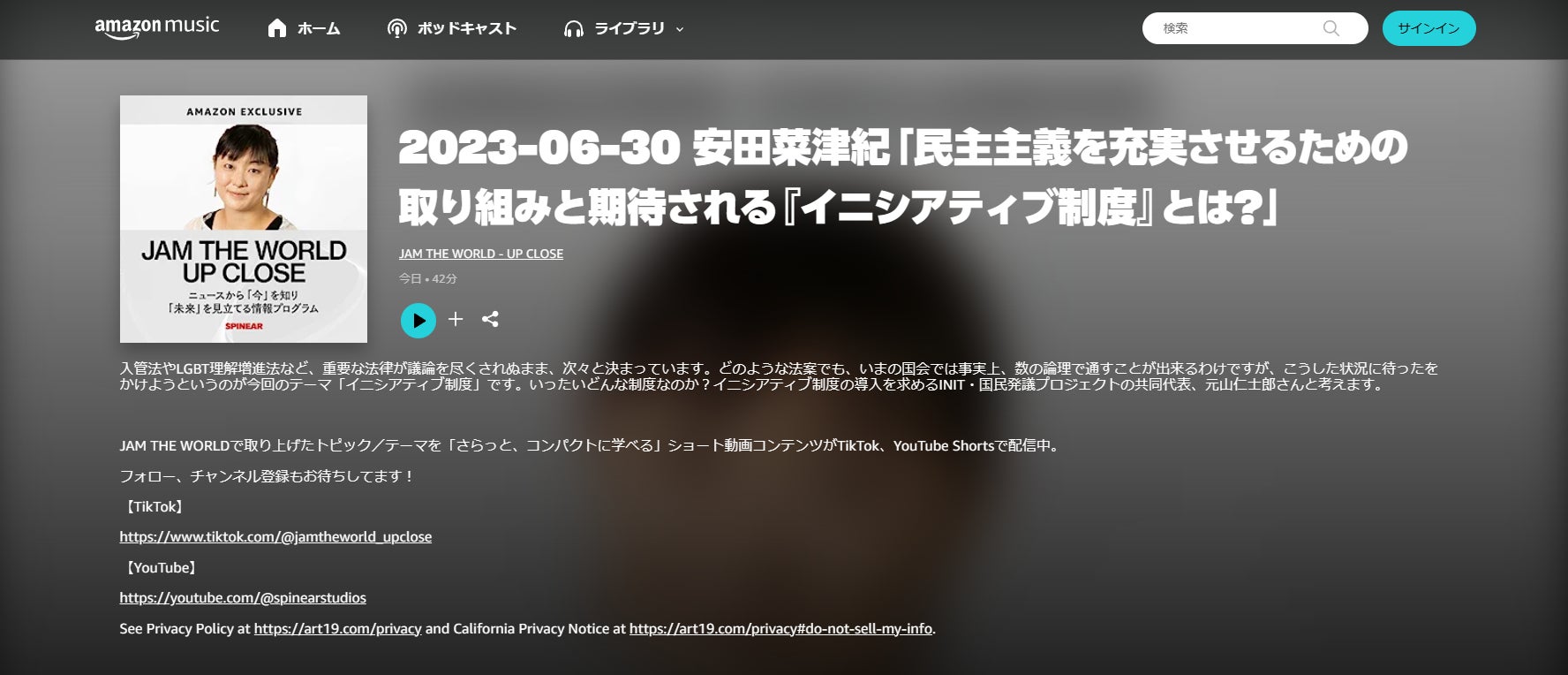 2023-06-30 安田菜津紀「民主主義を充実させるための取り組みと期待される『イニシアティブ制度』とは?」 | JAM THE WORLD - UP CLOSE Amazon Musicのエピソード