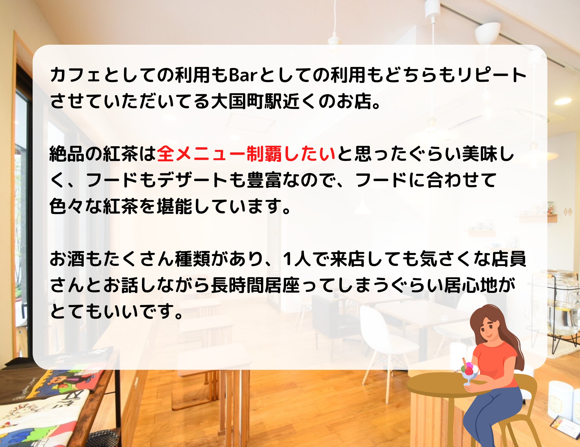 現在営業しているUPGREEN大国町店は、Teaにこだわったカフェ&バーです。日頃から皆様の健康促進と紅茶を楽しむお時間を提供することが目的で、そのために店主が厳選した極上の茶葉と香り豊かなフレーバーを使用しております。
