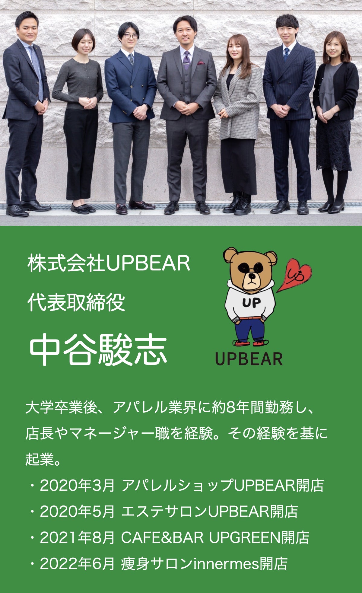 大阪のミナミエリア中心に店舗ビジネスをしている株式会社UPBEARの中谷と申します。数あるプロジェクトの中からご覧いただきありがとうございます。