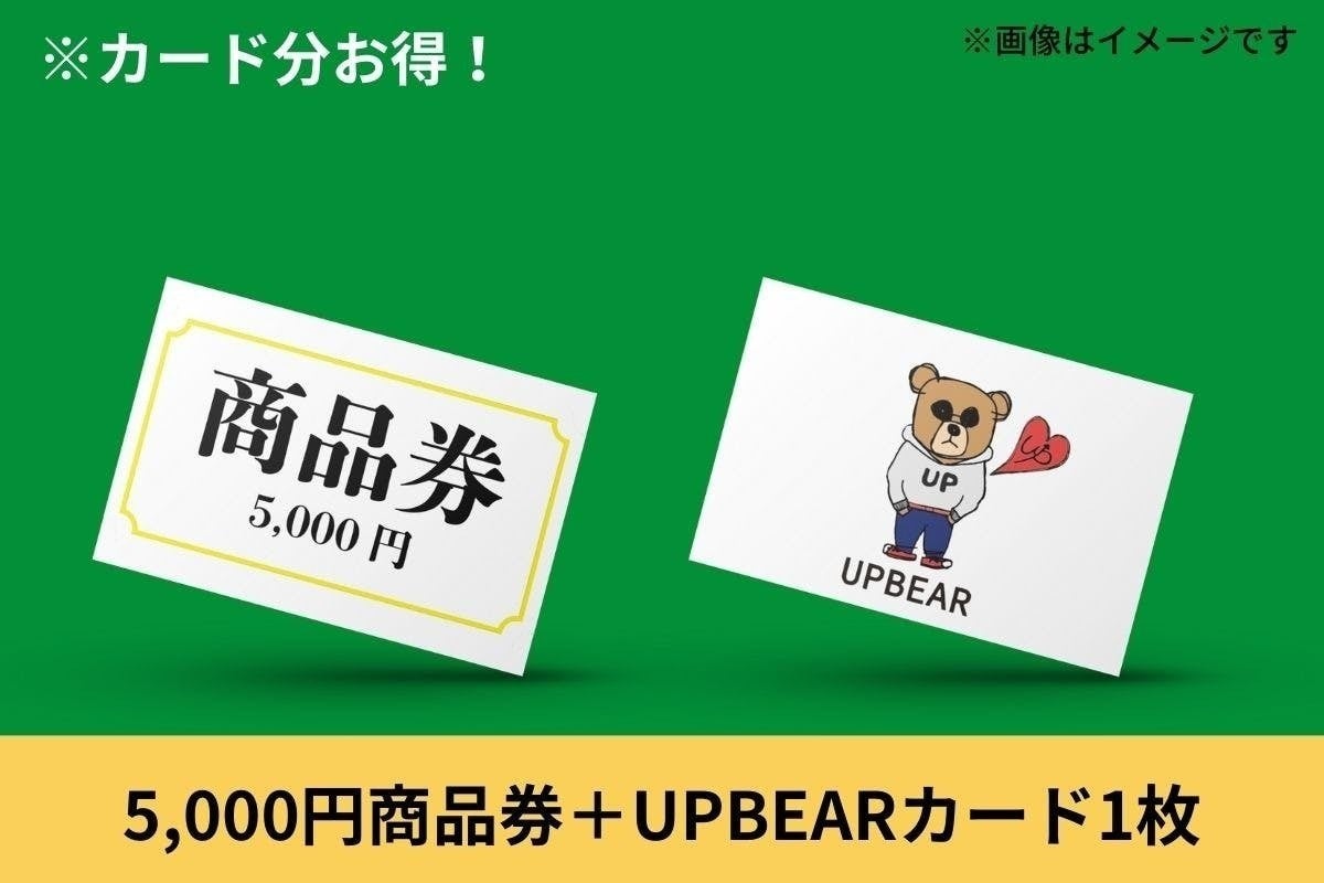 株式会社UPBEAR運営の店舗でご利用いただける商品券5,000円分+UPBEARカード1枚をお届けします。UPBEARカード分がお得なセットです。 (※UPBEAR各店舗で割引を受けられるカードです)