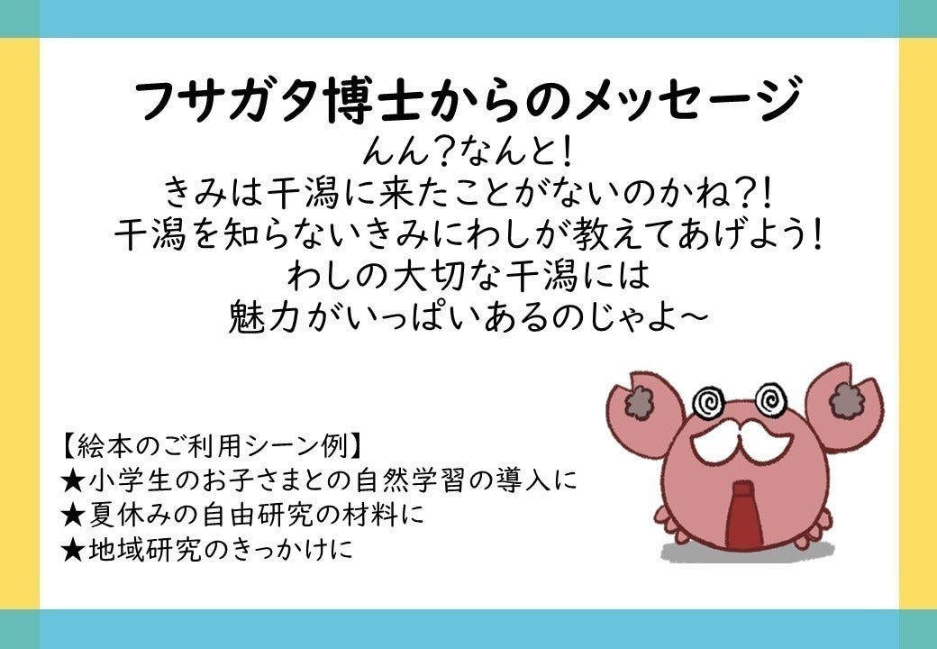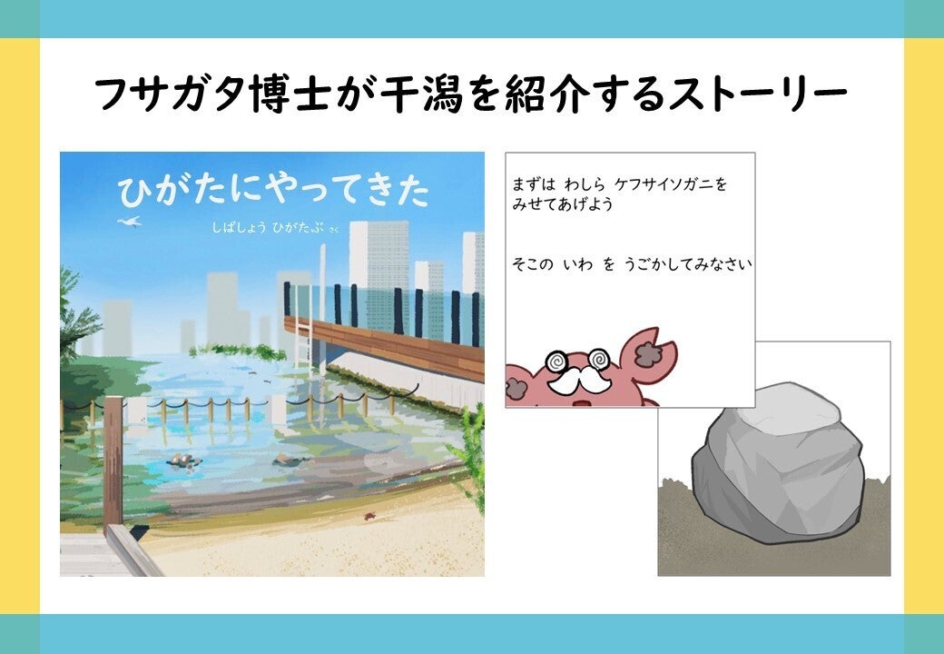 私たちが作成した絵本「ひがたにやってきた」はフサガタ博士というオリジナルのキャラクターが干潟の生き物などについて紹介するストーリーです。