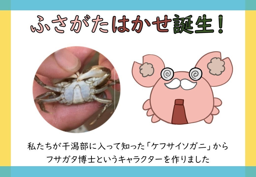 ここから、私たちが干潟で大好きになったケフサイソガニをモチーフにした、絵本のメインキャラクター、【フサガタ博士】が誕生したのです!