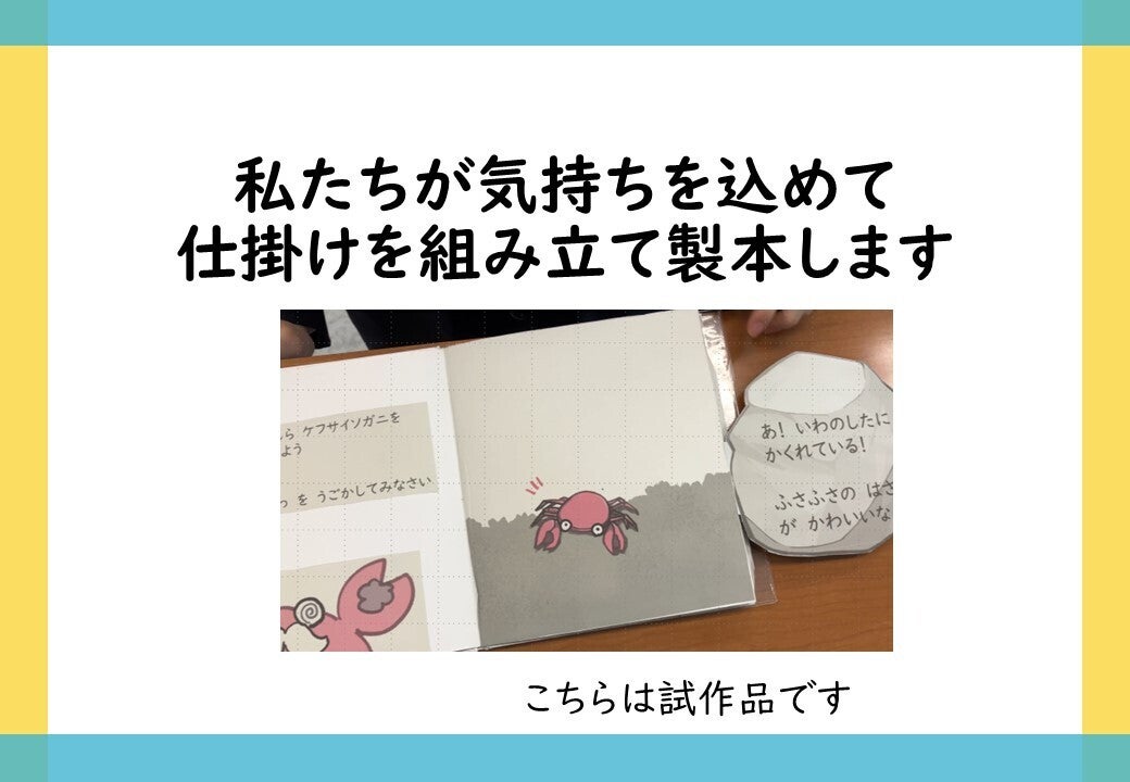 絵本については、シンプルな絵本、飛び出す仕掛け絵本などいろいろと試作をしました。その中で、楽しく学べるような仕掛け絵本にたどりつきました!