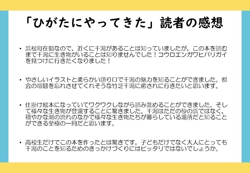 でも”きっかけ”がないと干潟に手を伸ばせません。私たちはたまたま先生の誘いにのって干潟部に入ったことが”きっかけ”になりましたが、先生の誘いがないと干潟に興味をもつことはできないのでしょうか。芝商業高校で干潟部に入部しないと干潟を知らないままなのでしょうか。干潟について知る”きっかけ”が高校生になる前、小学校・中学校のうちにあることで、高校生や大人になったとき「干潟」を難しいものとして捉えなくなると思います。そしてその子が親になったとき、自分の子どもにも干潟について伝えることができればこの「ひがたにやってきた」の本の役目が果たせると思います。