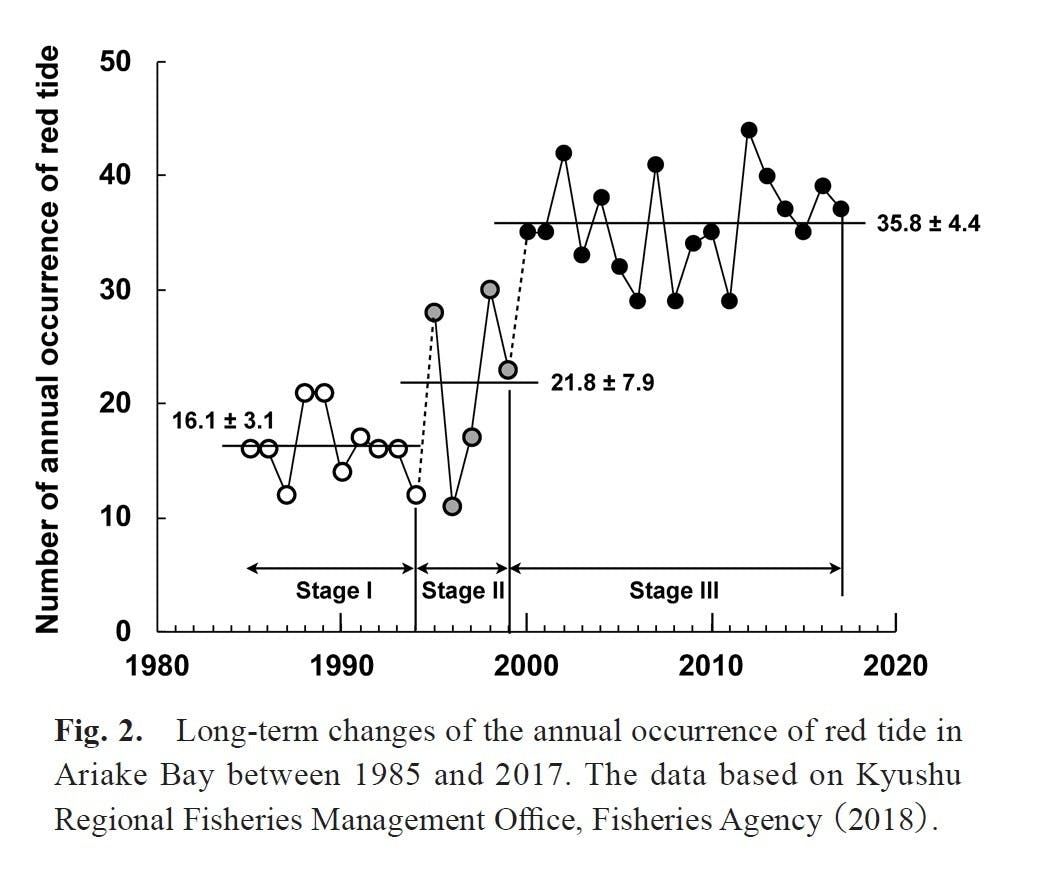 有明海の赤潮発生の動向について報告されている資料の紹介です。題名:「有明海の赤潮頻発に端を発する生態系異変のメカニズム」報告者 堤 裕昭 日本ベントス学会誌 2021年 76巻(p.103-127)https://www.jstage.jst.go.jp/article/benthos/76/0/76_103/_article/-char/ja/※掲載図参照なお、掲載図は同論文からの転用です。赤潮の発生記録(1985年~2017年)からStage1 1985~1994年Stage2 1995~1999年Stage3 2000~2017年に区分し、Stage1とstage3は統計的にも有意な差があるとされ、2000年以降は高止まり状態が続いていると報告されています。応援よろしくお願いします。