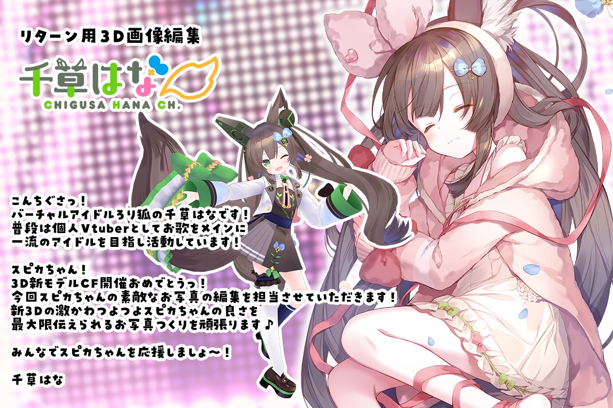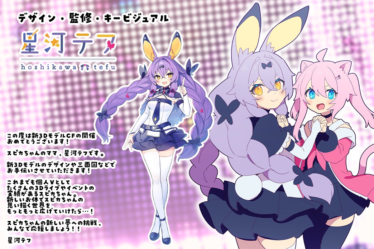 真綿スピカのキャラクターデザイン・2Dモデル・現在の3Dモデルを制作してくださった星河テフさまに、新3Dモデルのための新衣装デザイン・新3Dモデル制作の監修・新衣装のキービジュアルを制作していただけることになりました。
