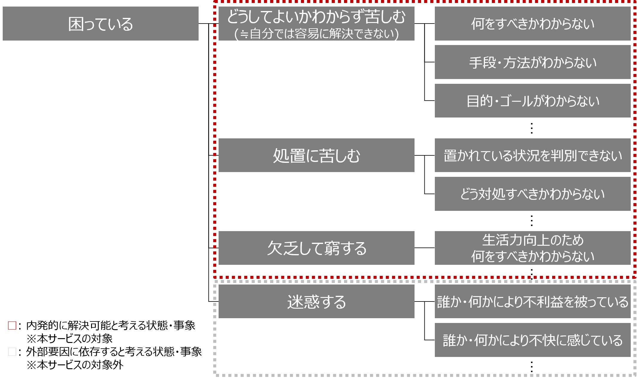何かに困っている方全般を対象としておりますが、一言に”困っている”といっても、解決の手立てとして内発的に解決可能か、外部要因に依存するかによって解決策も異なります。