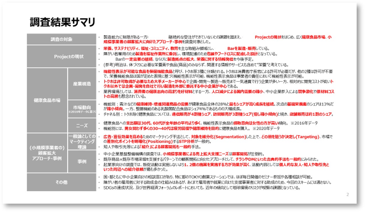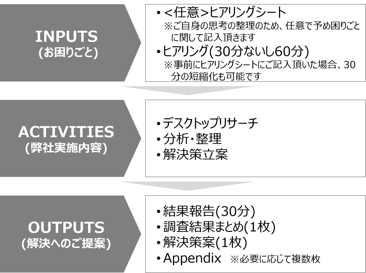簡易的な調査(デスクトップ調査)、解決策案、およびご報告がリターンとなります。