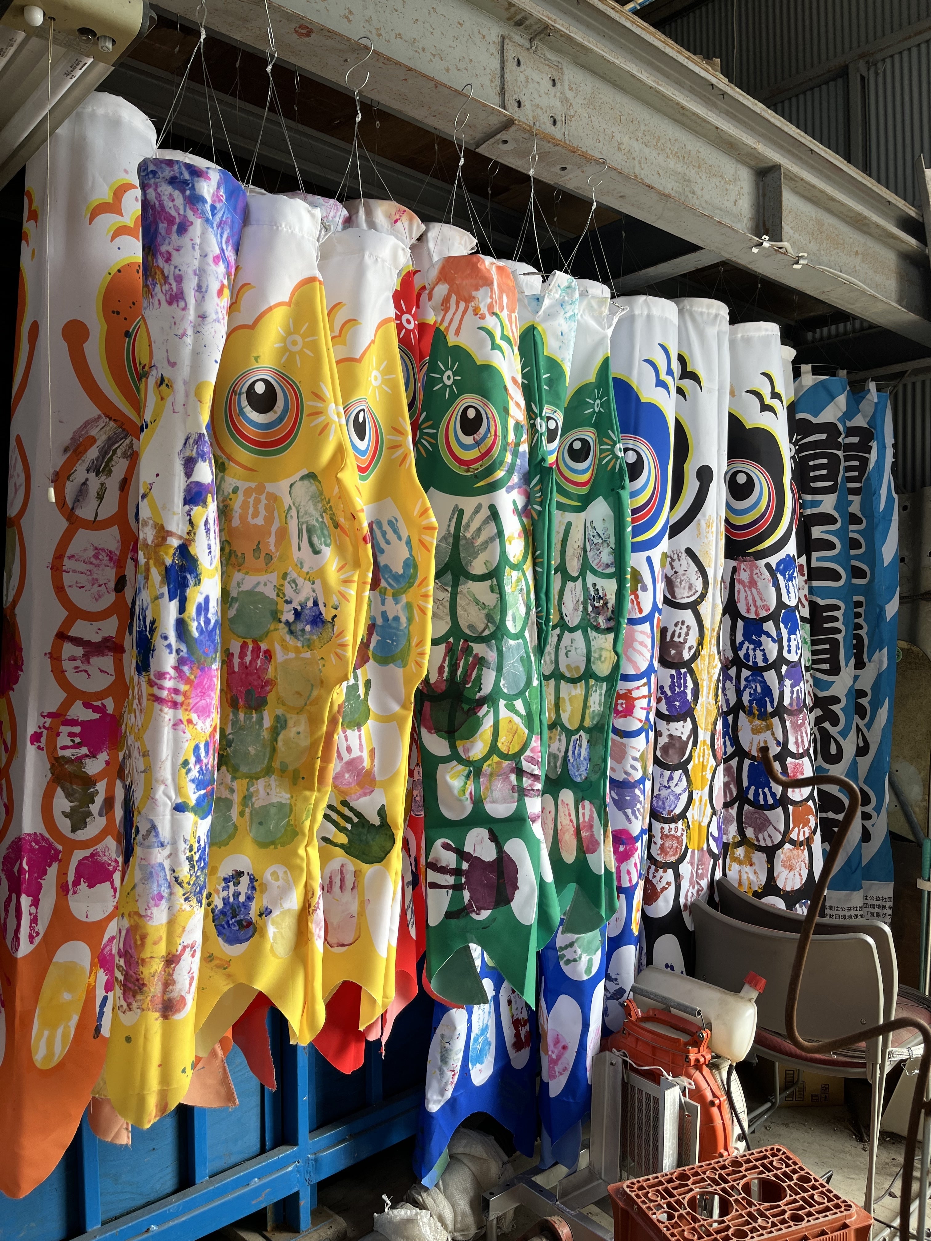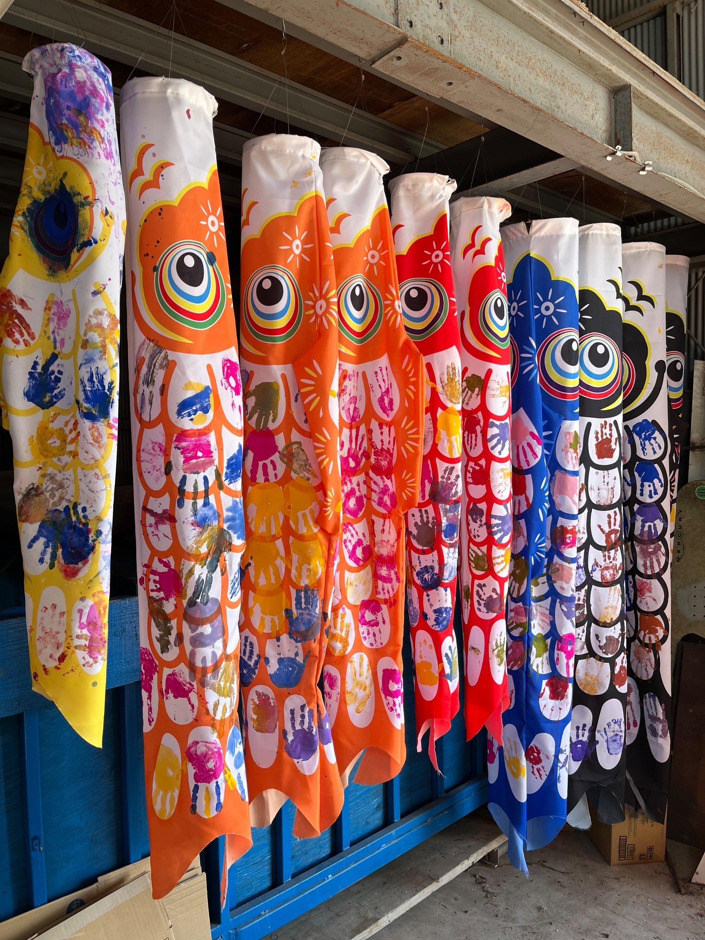まず1年目は町内の子どもたちにも参加してもらい、鯉のぼりを印刷し、鱗の部分に子どもたちの手形を押した鯉のぼりを幾つか作成し掲揚してみました。