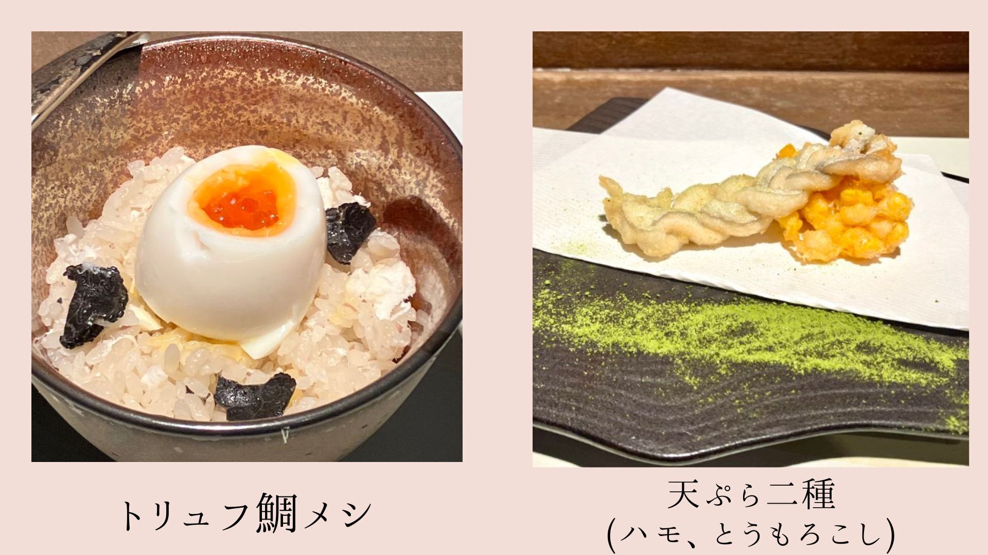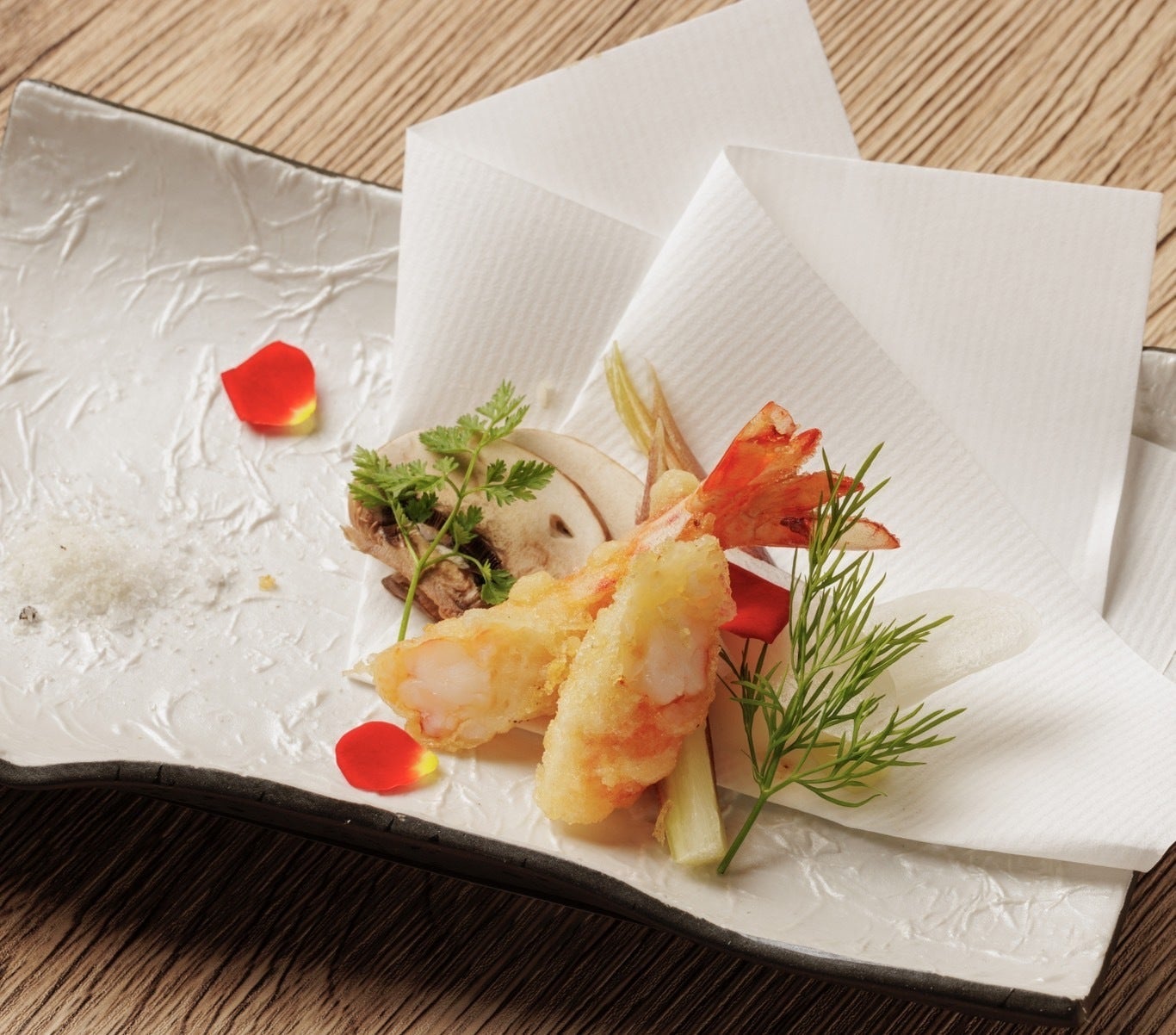こちらは定番のえびの天ぷらですが、見た目にも楽しんでいただける飾り付けや、食材に合うさまざまな塩をご用意してお待ちしております!