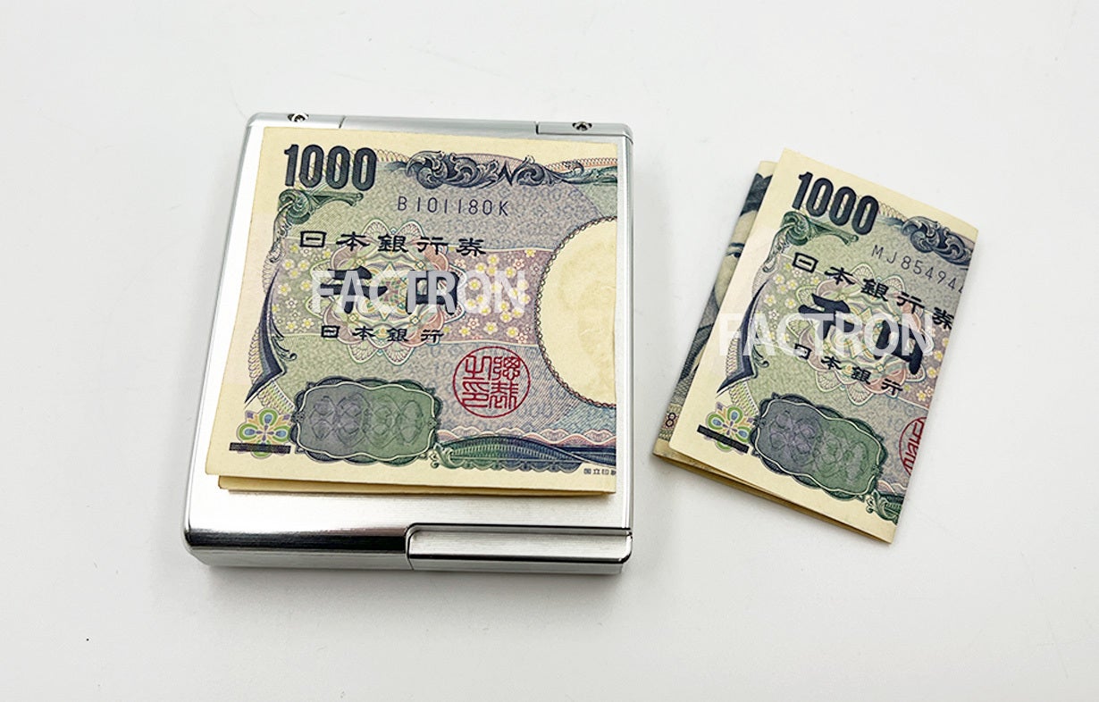 当初はクレジットカードサイズ+紙幣で考えましたが、その場合、お札が三つ折りか四つ折りになり、たたむ手間が必要になります。