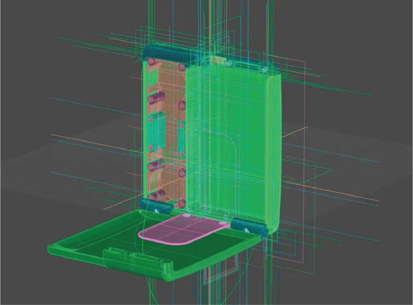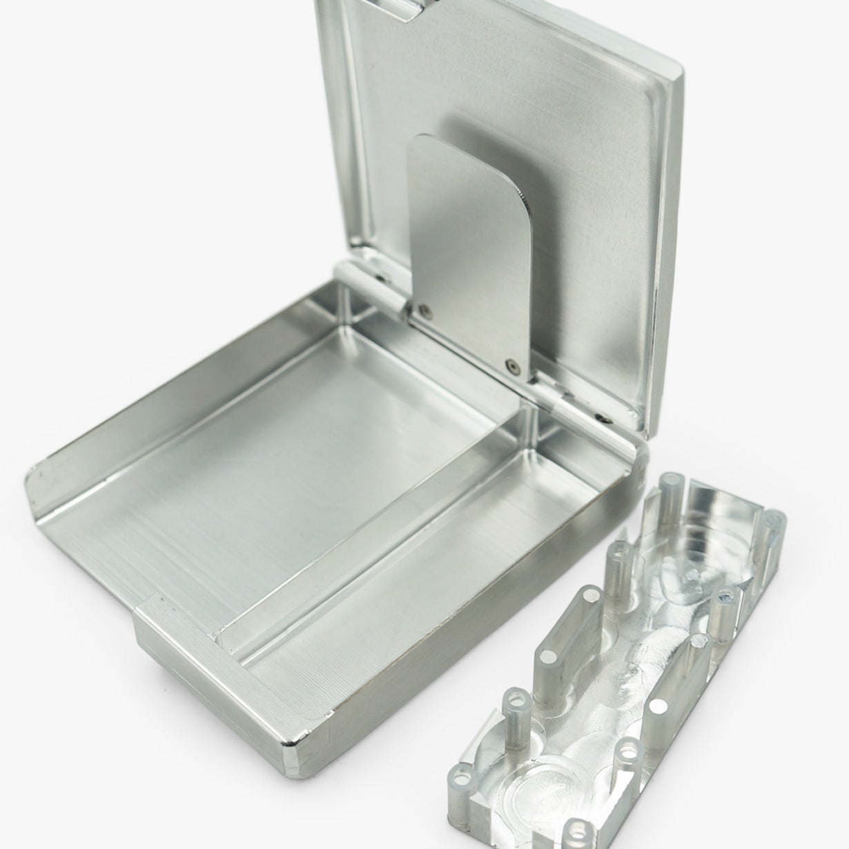 メタルウォレットBoxyのジュラルミンモデルは、無垢の材料から一つ一つのパーツの状態になるまで、1セットで10時間43分かけて3次元削り出し加工をします。
