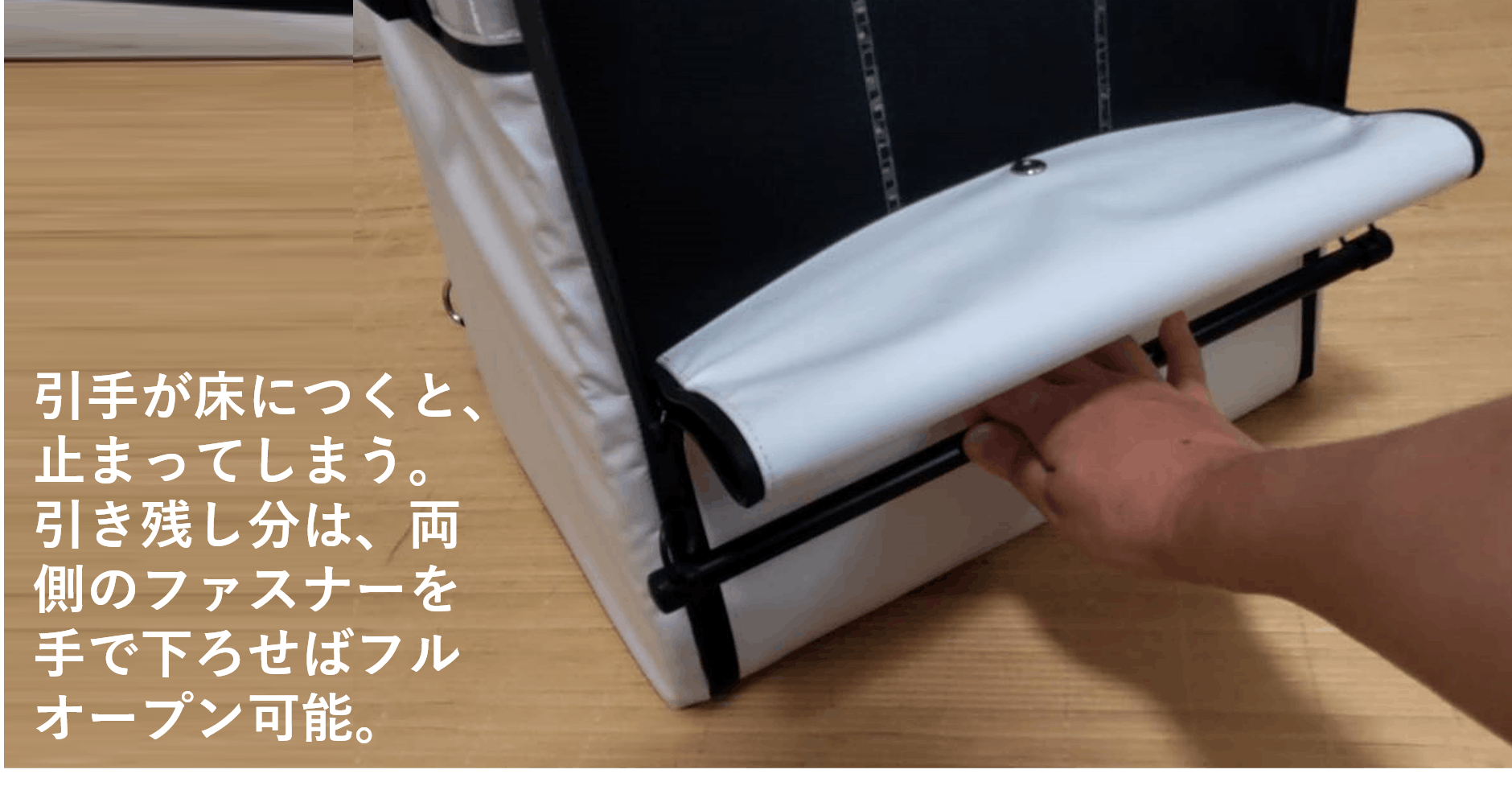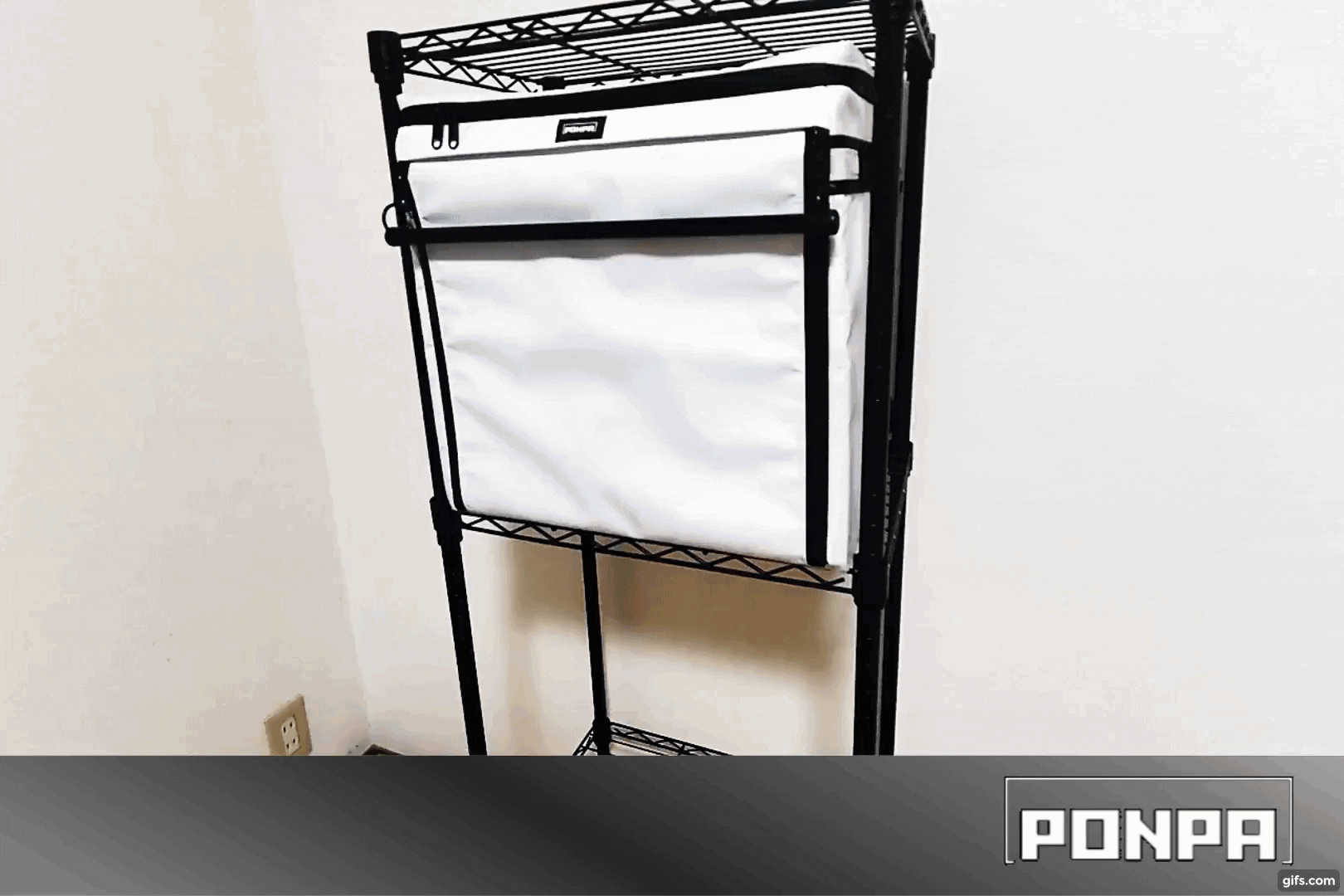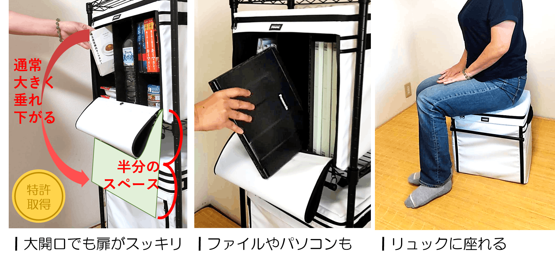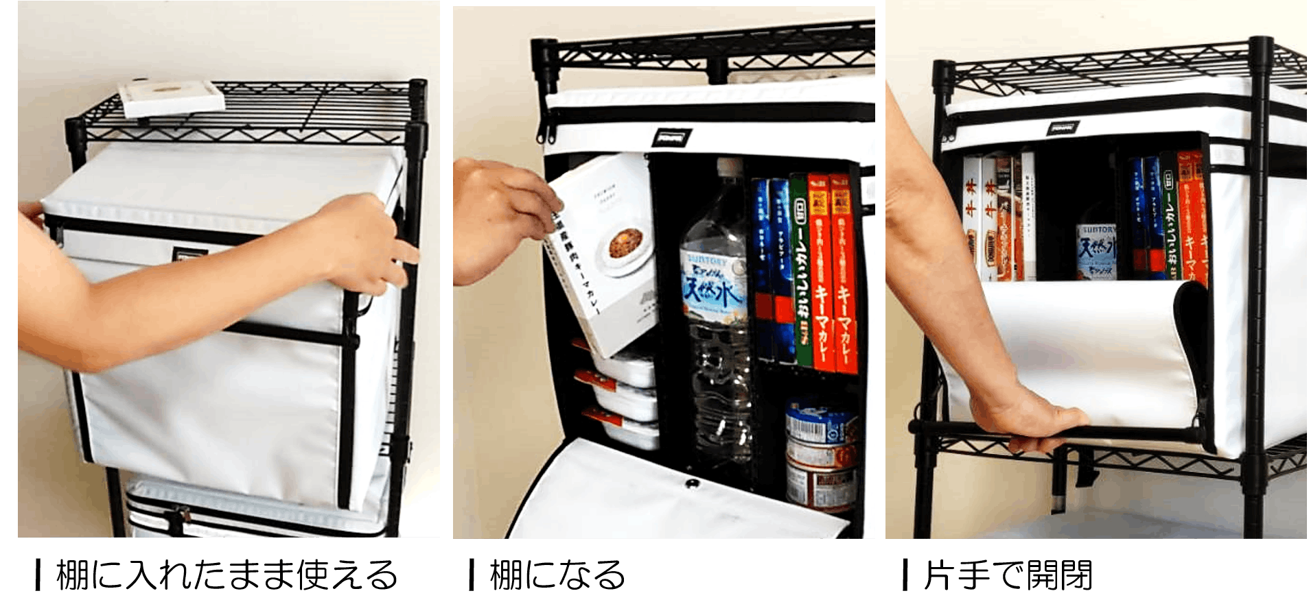 市販の棚に入れたままでも物の出し入れができ、開口部を片手でフルオープンできるので中身の管理も簡単!