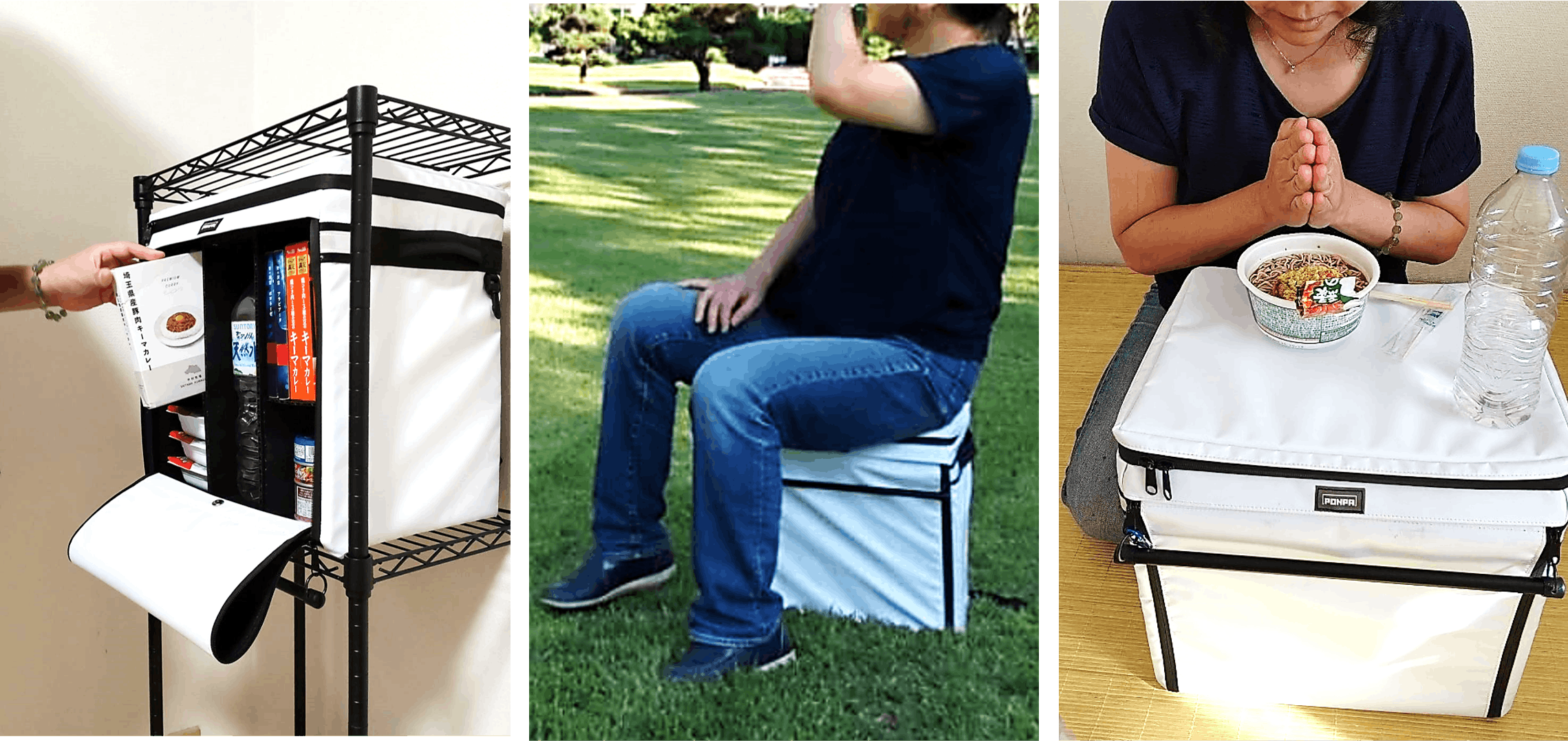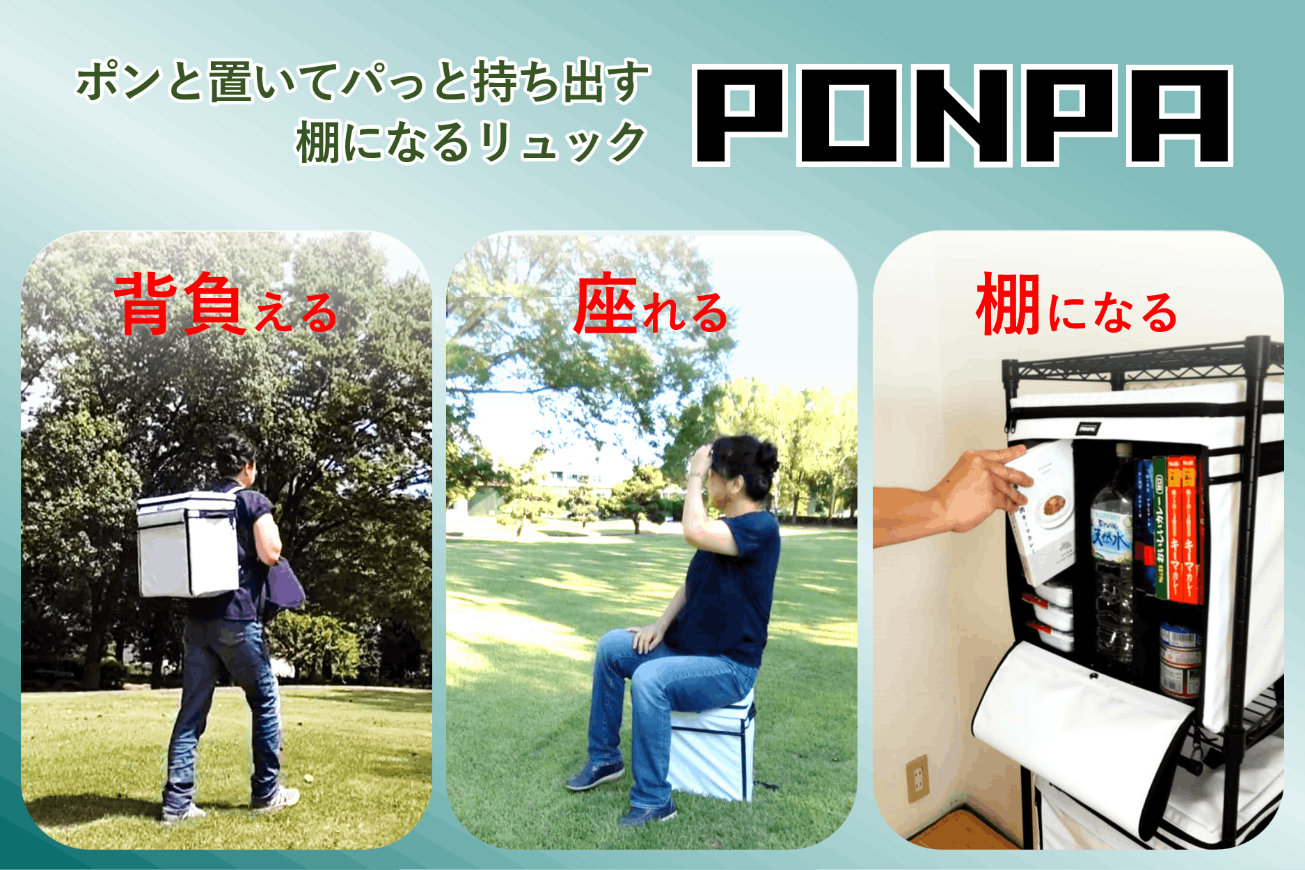 こんなの欲しかった!普段から使える防災リュックで「災害時に常備品を持ち出せるようにしておく備え」に変え、新しい防災ライフを始めませんか。身近な場所で棚の様に使えて管理が簡単、イスやテーブルにもなる、ローリングストックが出来るフェーズフリーな防災リュック「PONPA」。企業のBCPにもお役立ち!