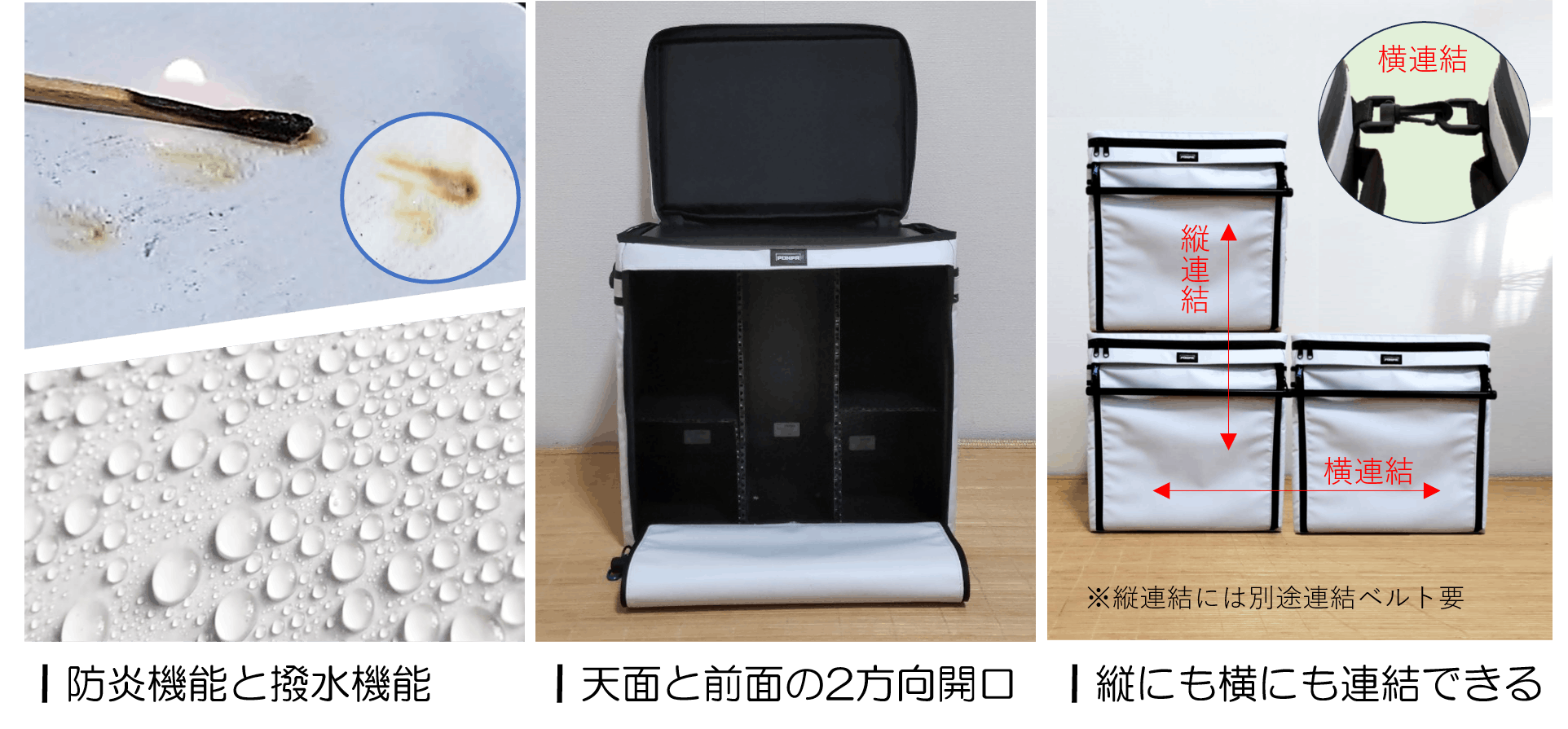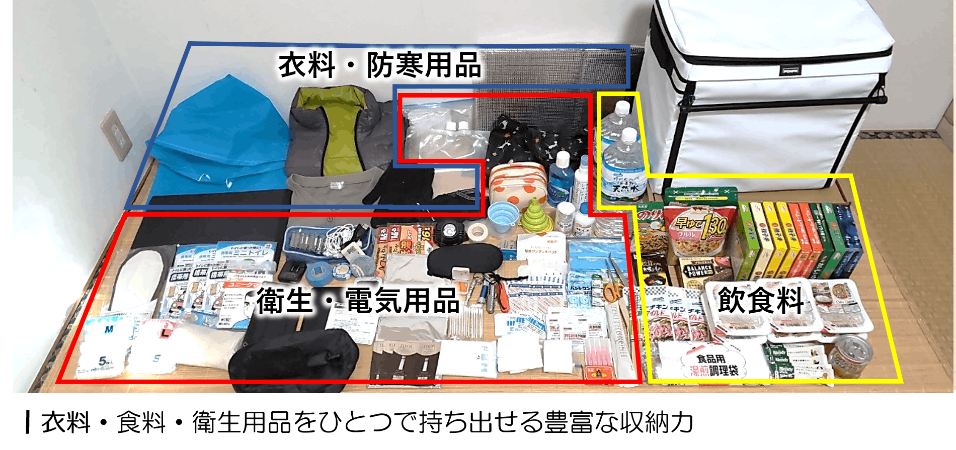 しかも、衣料品や衛生用品も一緒に持ち出せ、避難先ではいち早くパーソナルスペースを確保出来るのです。