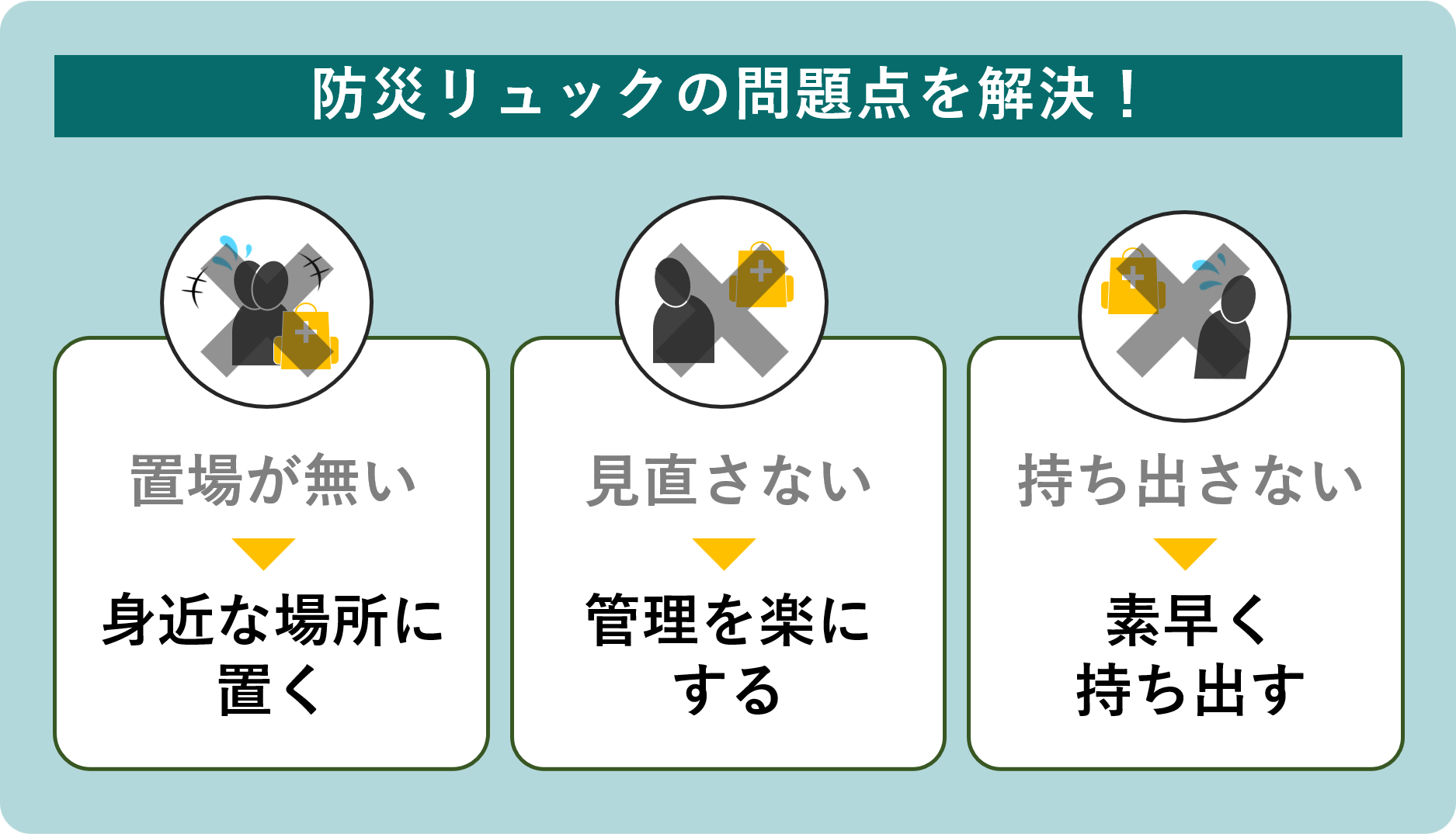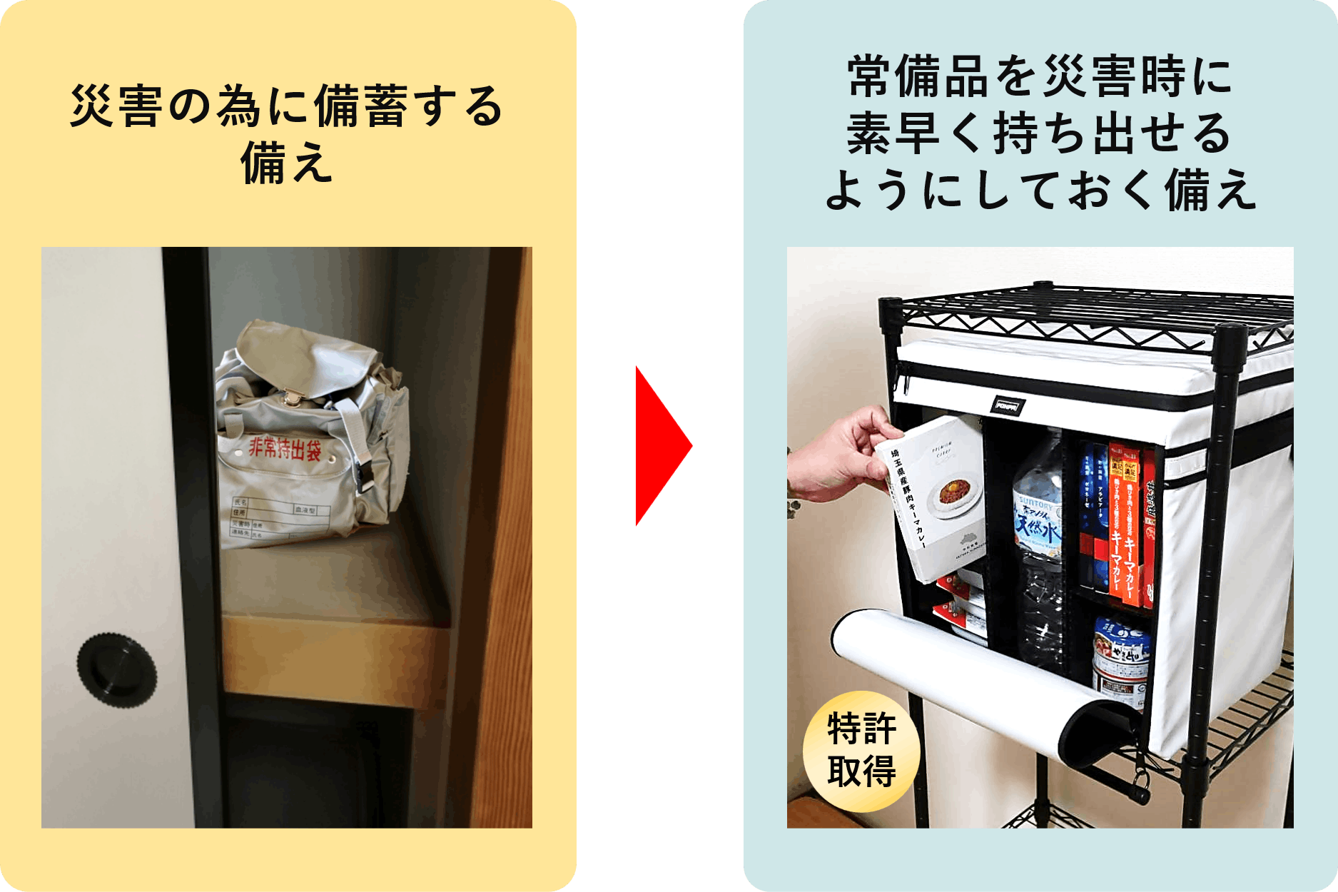 これまでの防災リュックの多くは棚に入れたままでは中身の出し入れがしにくく、管理を忘れがちでした。その結果奥に追いやられ、見直さなくなり、いざという時には賞味期限が切れていたり持ち出せないこともあったのです。