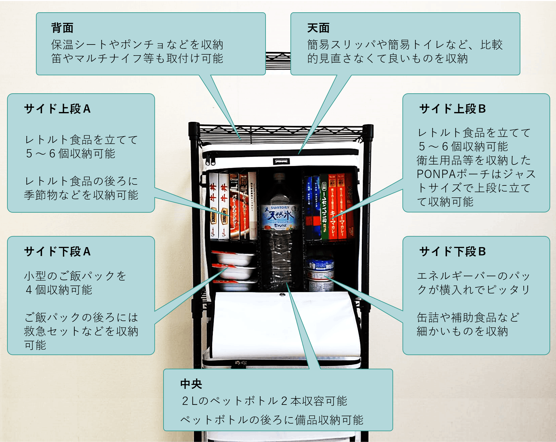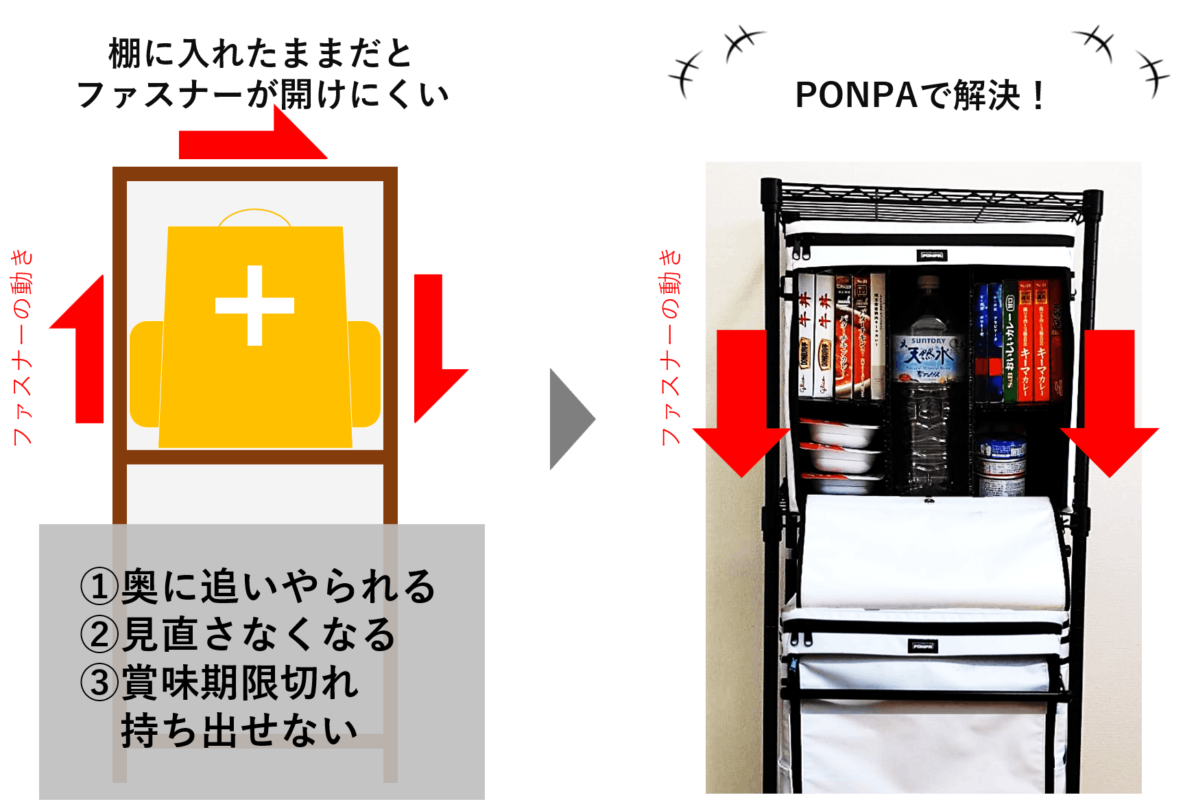 「PONPA」は、市販の棚に「ポン」と納まるちょうどいいサイズで、中身の管理がしやすく、いざという時にはそのまま「パ」っと持ち出せる優れものです。