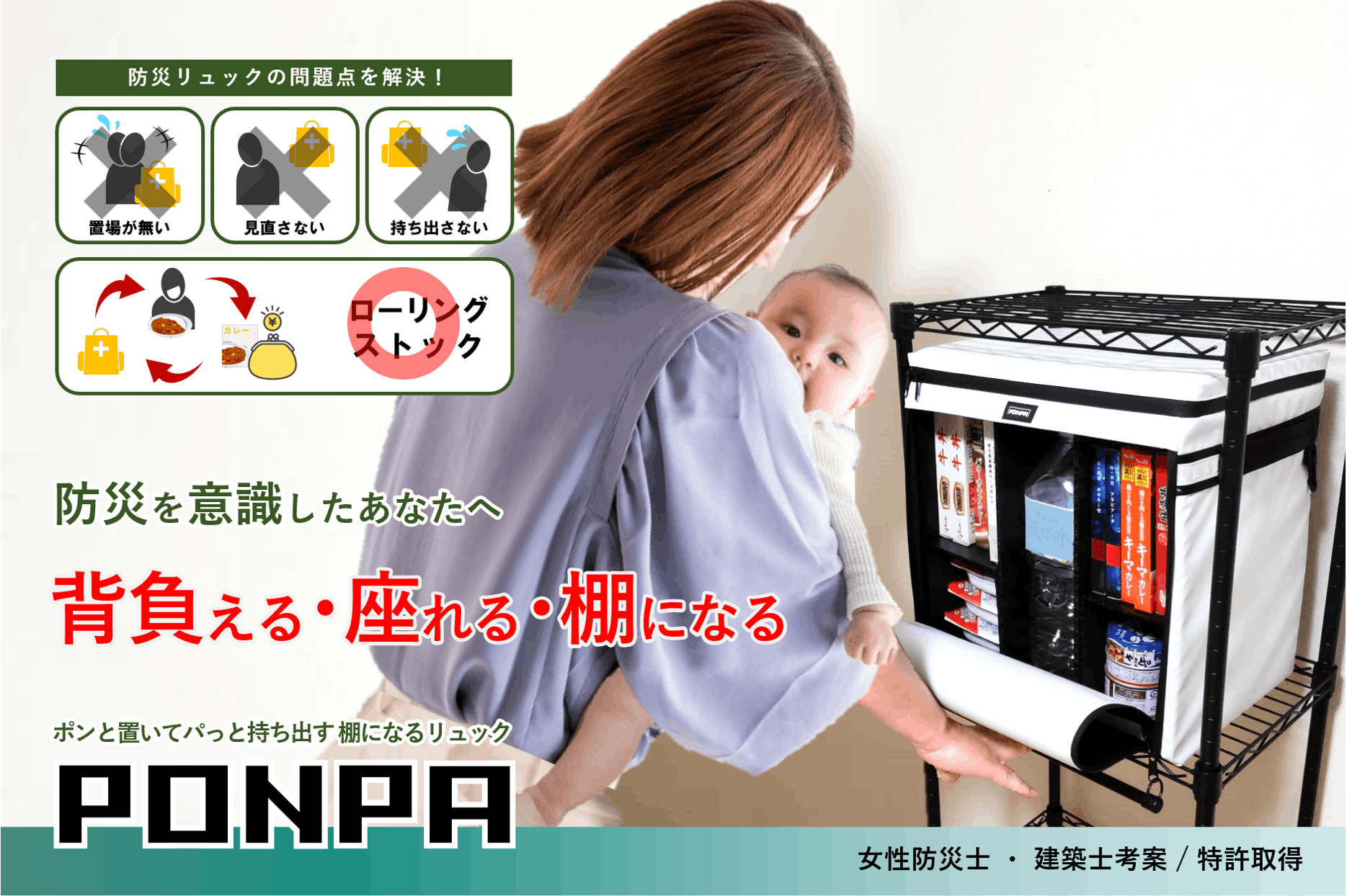 そこで、女性防災士であり建築士がその知識を生かしてこれまでの防災リュックの問題点を解決し、普段から使えて災害時にそのまま持ち出せる、進化した防災リュック「PONPA」