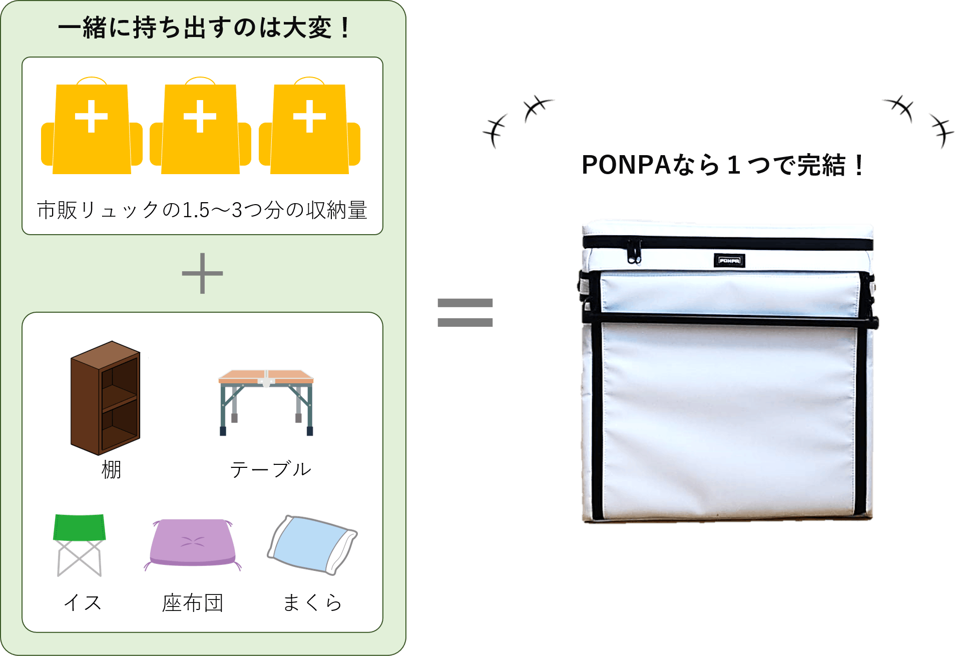 「PONPA」は、避難時に焦らず必要な物を持ち出す、災害初動3日間の自助を支えるために進化した、棚になる防災リュックです。