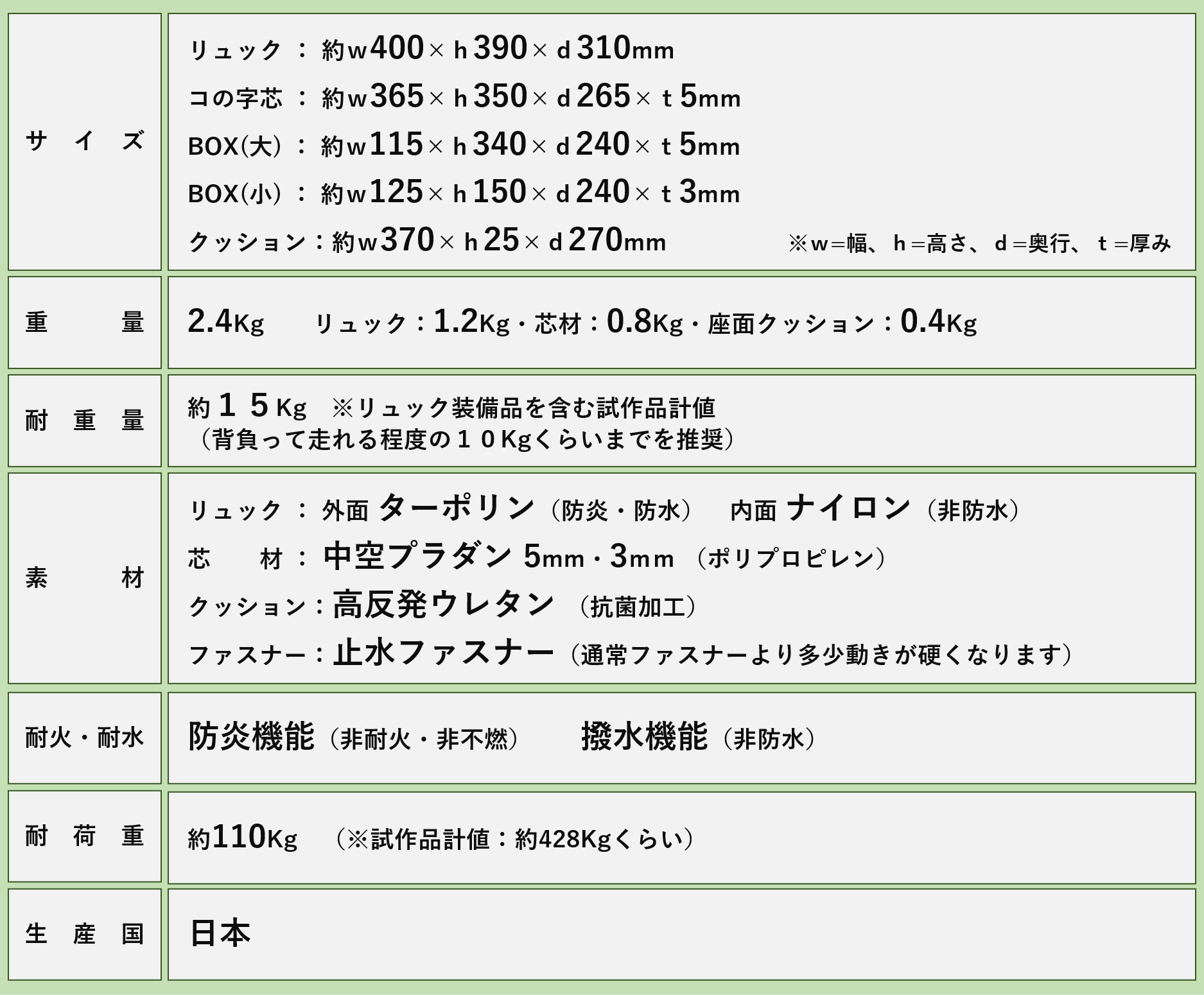 衣料・食料・衛生用品をひとまとめに収納でき、普段から棚の様に使ってローリングストックが出来る利便性と、イスやテーブルとしても使える機能性を持ち合わせた、平時と災害時に役立つフェーズフリーな防災リュックです。