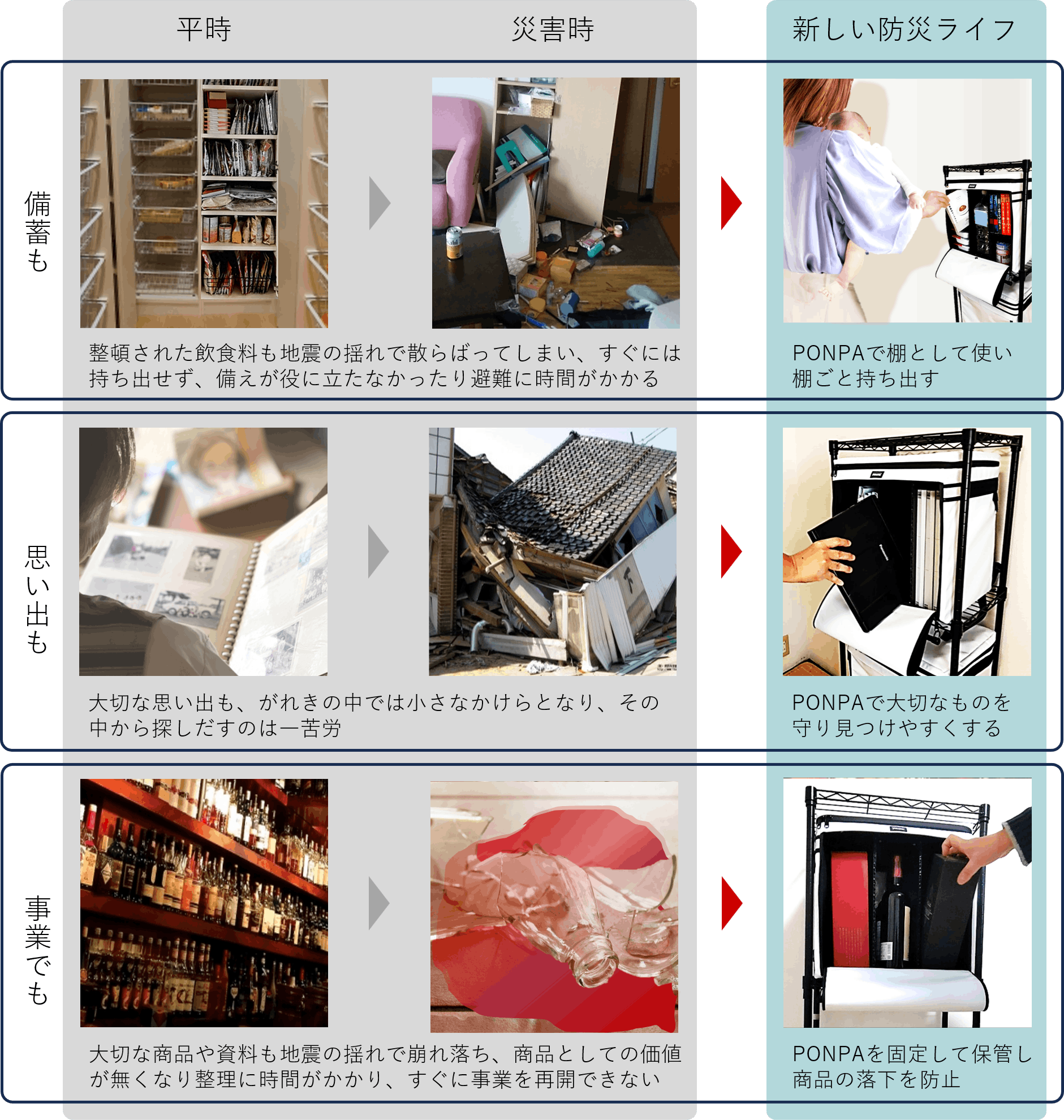 「PONPA」でこれまでの「災害の為に備蓄する備え」から「常備品を災害時に素早く持ち出せるようにしておく備えに変え、スムーズな避難を一緒に実現させましょう!