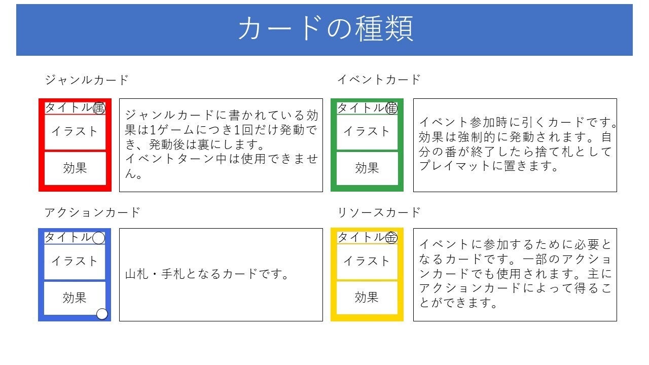 このカードゲームはアクション(創作活動)やイベント(コミケ出展)を行い、FP(フォロワーポイント)を集めていくゲームです。FPをたくさん集めて壁サーになりましょう!!