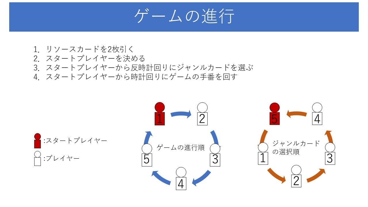 2.スタートプレイヤーを決めてください。ゲームは時計回り順に進行します。スタートプレイヤーの右隣の人から反時計回りで好きなジャンルカードを1人1枚選択し、既定の場所に表にして置いてください。