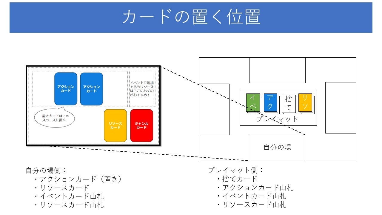 4.リソースカードを各プレイヤーは自分の場に2枚置いてください。残りのリソースカードはプレイマットに置いてください。