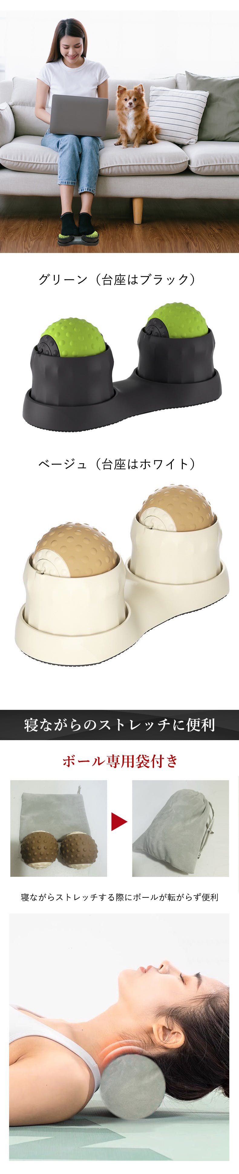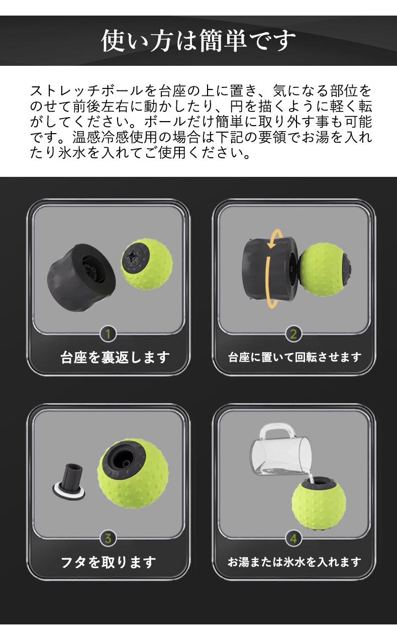 <使用方法>・ストレッチボールを台座の上に置き気になる部位をのせて前後左右に動かしたり、円を描くように軽く転がしてください。・温感使用の場合はストレッチボールの中にお湯を入れたり氷水を入れてご使用ください。・お手入れは、水洗いしてから乾燥させてください。・取り扱い説明書をよく読んでからお使いください。強く刺激をすると痛みを感じることがありますのでご自身で加減してください。