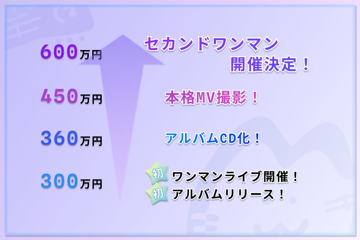 ライブのクオリティアップやアルバムのCD化、本格プロモーションビデオ制作などを目標としておりますので、下記「ストレッチゴールについて」をご確認いただきますよう、よろしくお願いいたします。