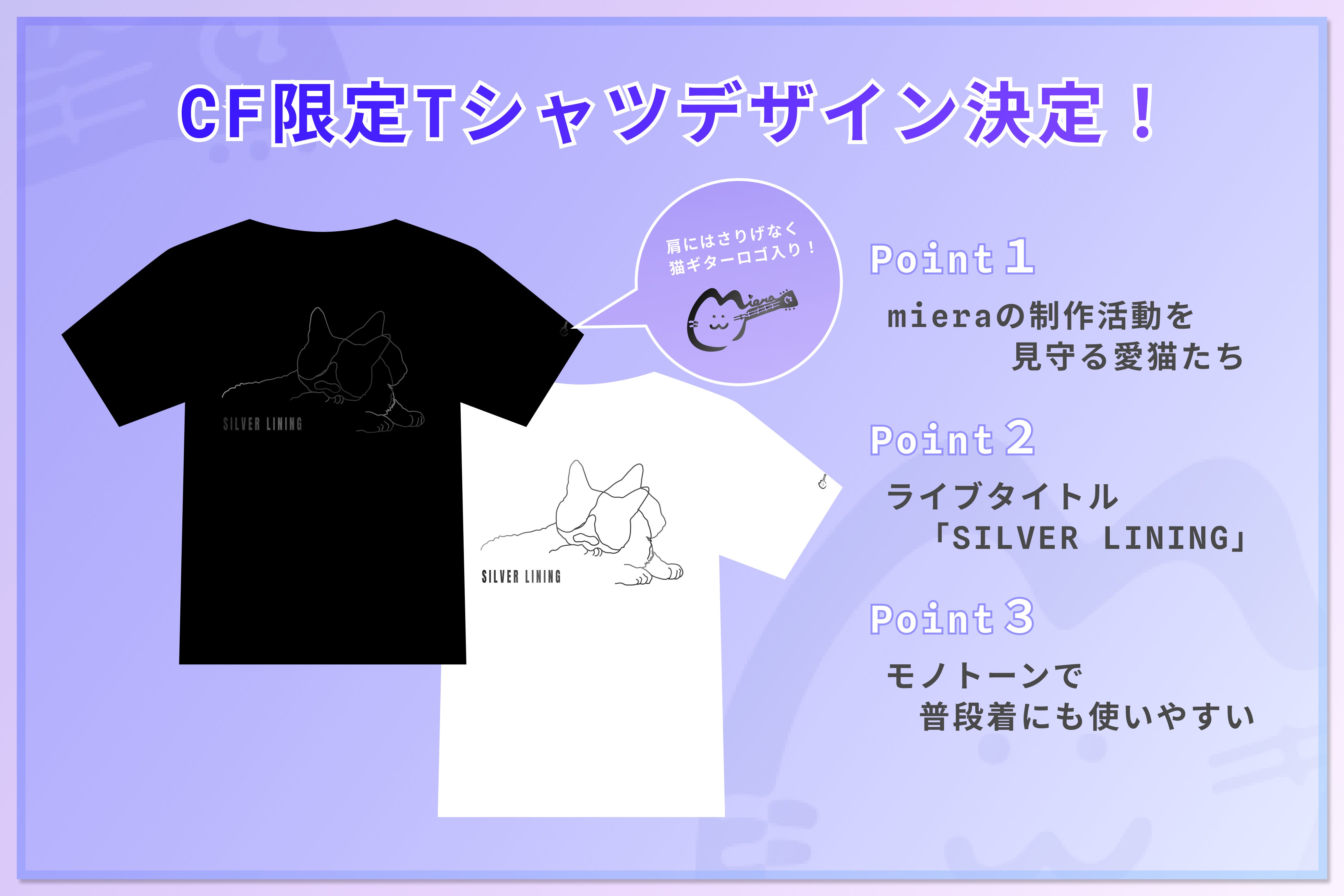 2023/06/20 15:41お待たせいたしました!クラファン限定mieraオリジナルTシャツ、ついにデザイン公開です!!あえて普段着でもお洒落に使いやすいよう、シンプル且つモノトーンにしました。猫が2匹いますが、制作活動を見守ってくれた、わたしの一部でもある小春先生とタロウです。彼らがいなけれな、生まれなかったメロディーもあるといってもいいほど、私の制作活動や配信活動において欠かせない存在であった二匹。分かる人には分かる、激カワレアデザインです。CF限定のため一般販売、ライブ当日の物販も一切いたしません。※当プロジェクトサイトにて7/23(日)までの枚数限定販売のみとなりますのでご注意ください。欲しかったよ〜!!涙とならないように、お色も迷ってる方は迷わず2色買いもおすすめします。笑そしてぜひライブ当日着てきていただけると嬉しいです。ステージから泣いて喜びます。;;いつか大成長して、あのmieraの初ステージ応援したときの限定Tシャツだ!メルカリで倍で売れる!!笑 って皆さんに恩を何倍返しもできるように飛躍してみせますね。ぜひmieraの成長を信じて投資と思って沢山買っておいてください!!.*「プロジェクトを支援する」から限定Tシャツが返礼にあるコースを選択していただくとお求めできます。【※既にCF限定オリジナルTシャツを購入済みの方へ※】この度、デザインを二色展開にしたため、ブラックかホワイトのお好きな方をお選び頂きます。つきまして、既にCF限定オリジナルTシャツを返礼品に含むコースをご支援くださった方々に、ご登録頂いたメールアドレス宛に後日(今月中を予定)、ご希望のカラーの確認メールをお送りいたします。お手数おかけしますが、ご返答どうぞよろしくお願い申し上げます。 もっと見る