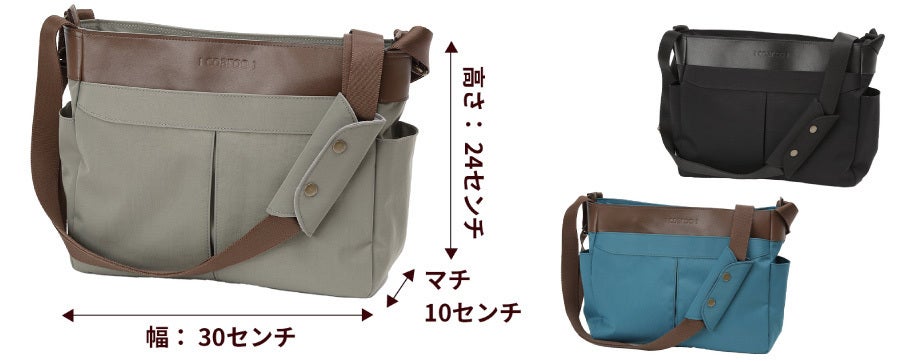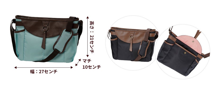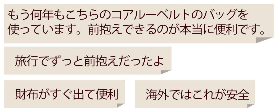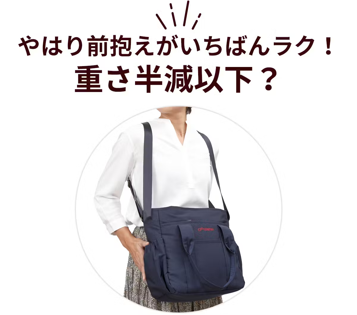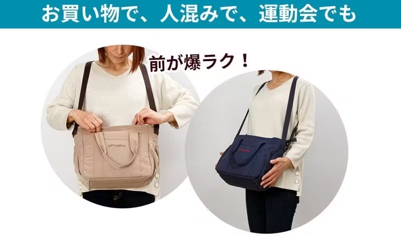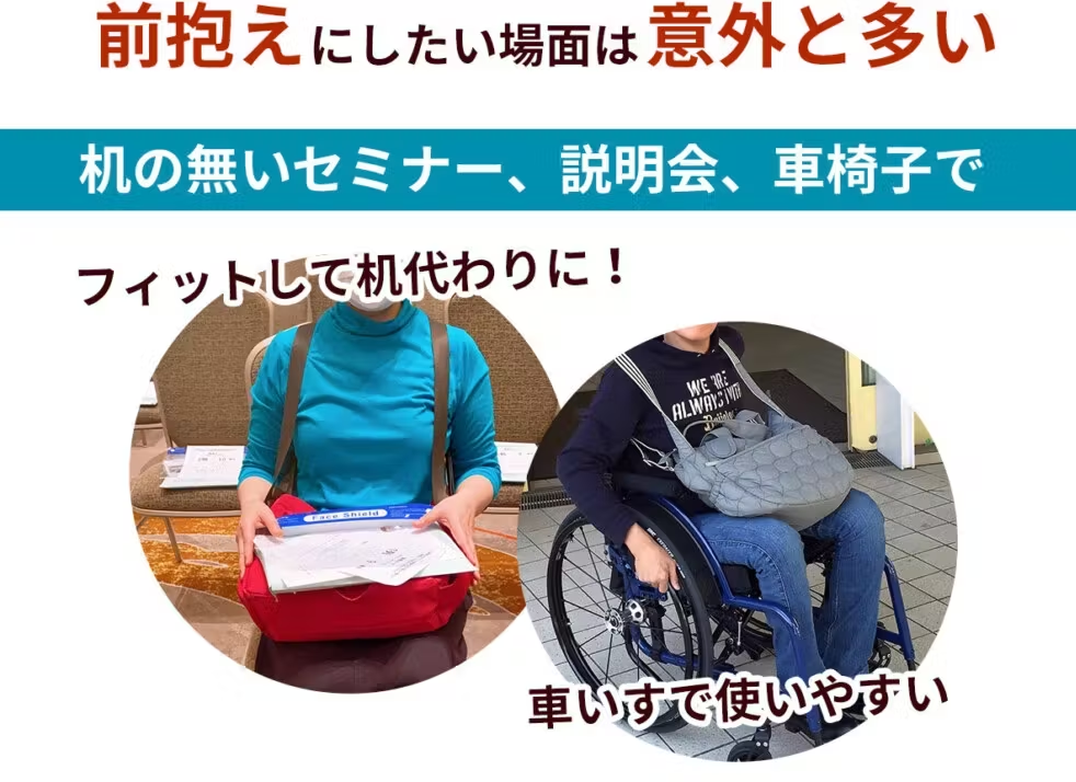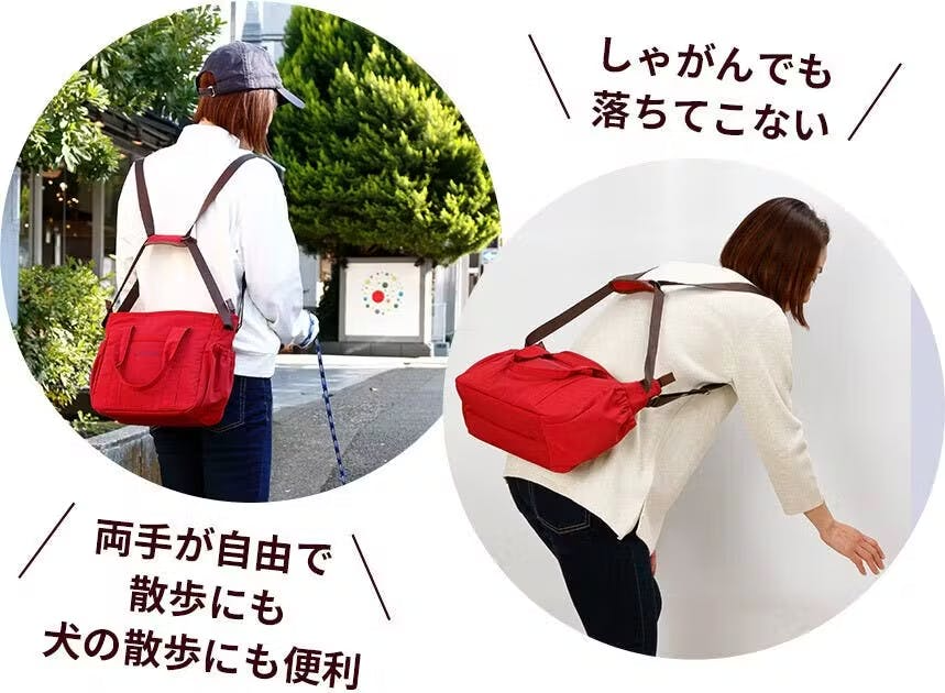 そして利用者の方が口を揃えて感心されるのは、前抱えのラクさです。背中と両肩とお腹に重さが分散するため、重さをほとんど感じないレベルに?! 真ん前からモノを出し入れするととても便利で、屈んでも前に落ちにくく、かといって締め付け感を感じるわけでもない。長時間立っていても座っていてもフィットして軽く感じるから、ずっと掛けたままで居られます。傘を差してもいちばん濡れにくい場所でサブバッグやリュックとの併用、エコバッグや杖などを持ってもぶつからないので、とても快適です。
