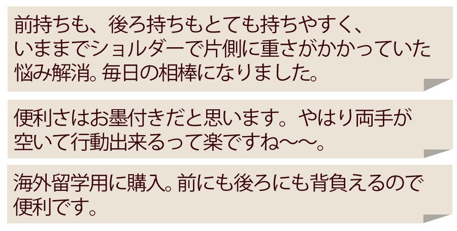 ちょっと心配なのは「こんなに下で重く感じないの?」それが、、、案外重く感じない!という感想がほとんどです。科学的に分析をしてみたい所ですが、おそらく両肩とお尻で重さを分散しているからだと思います。ただ、本当に重いカバンの場合には本格的なリュックをおススメします。