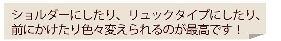 どばっと大荷物の時には、両肩に重さを分けてしっかり背負った方がもっとも軽く感じ、両手も自由に使えます。しかし、背中が暑い!モノを出すたびにいちいち下すのが面倒!前に持つと肩から落ちそうになる。