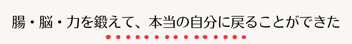 減量は「本当の自分になる」「本当の自分を思い出す」プロセスの副産物だったことが成功要因だったと思います。「腸」「脳」「力」三位一体のダイエットは自然にリラックスした気持ちで取り組めました。