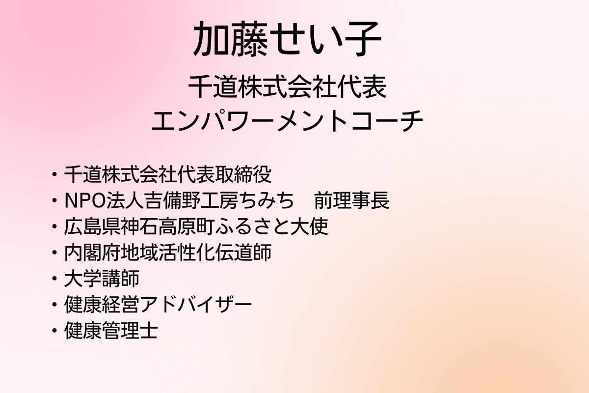 2014年人材開発コンサルタントを中心とする千道株式会社を設立。2018年1月乳がんの告知を受け、身体も会社も健康に経営することの大切を知る。
